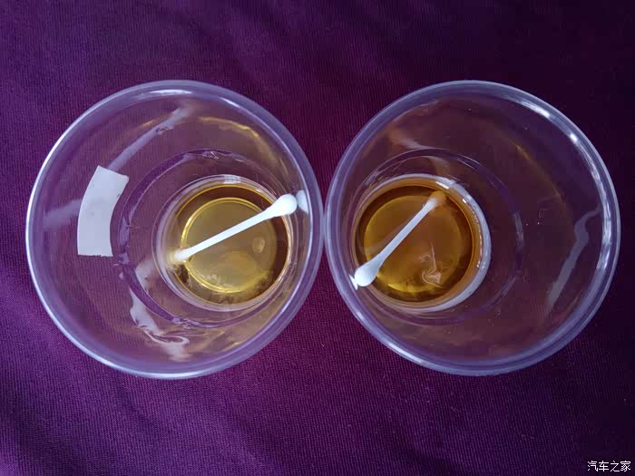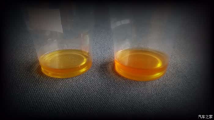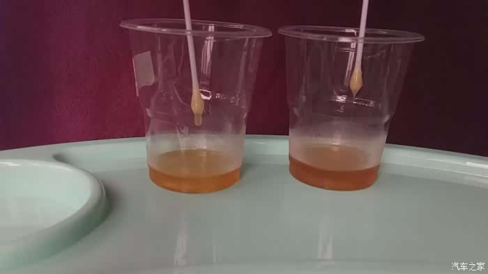 离上次保养具体时间不清楚,8、9个月是有的,但是机油寿命到0后已有几百公里。每次保养,壶里机油都会有残留,就用它做其他直观的对比测试。先是常温下的机油试纸测试, 然后放入冰箱冷冻24小时再做试纸测试。