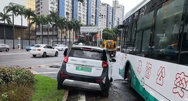6月8日早上,经过了一夜的暴雨洗礼,珠海各区的路面变得湿漉漉的。上午9时13分,拱北交警接到报警,在迎宾南路交粤海路路口发生了一起单方事故,一辆共享小车开上了绿化带。