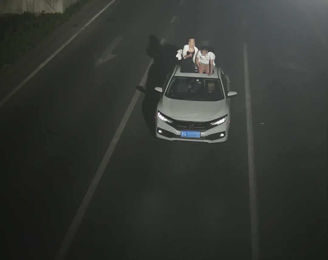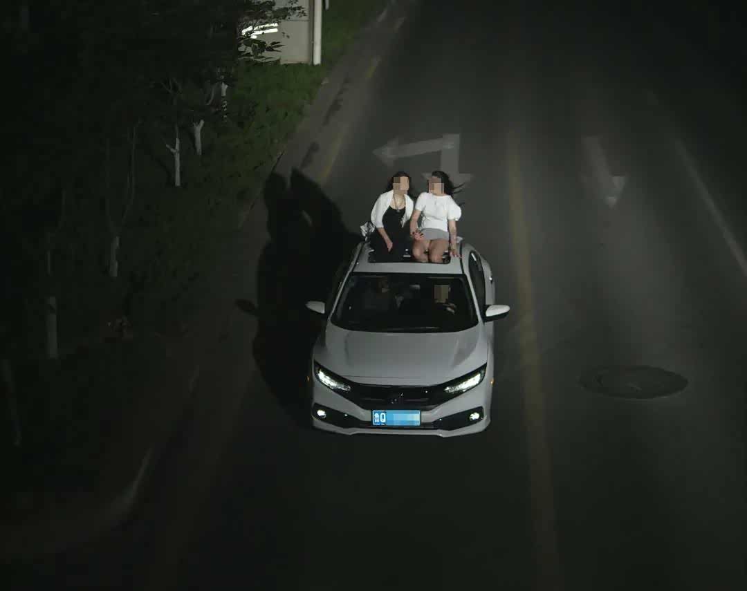 在画面中可以看到,当时天色已黑,一辆白色小型汽车正在行驶中,两位年轻女子坐在车顶天窗开口处“兜风”,旁边毫无任何安全措施。画面中街头的车流量并不小,路面上的状况瞬息万变,一旦车速过快或急刹车,坐在车顶的女子很容易从车顶跌落,又或被硬物、高空悬物砸到,后果不堪设想。