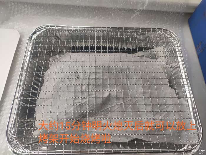 按照说明,在引火纸燃尽后需等待十五分钟,让炭尽量被引燃,便可以放上烧烤网开始美食之旅啦