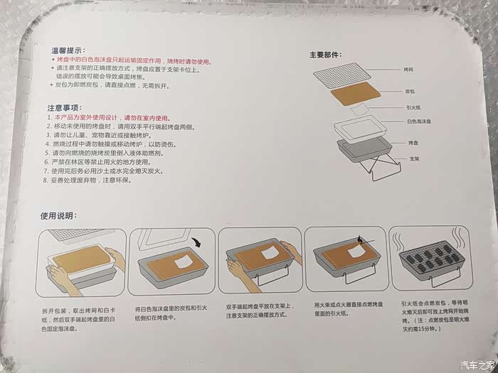 这个白色泡沫板主要的作用就是在运输过程中隔绝机制炭与烧烤网接触,这样的小心思非常人性化,因为烧烤网毕竟是接触食物的。