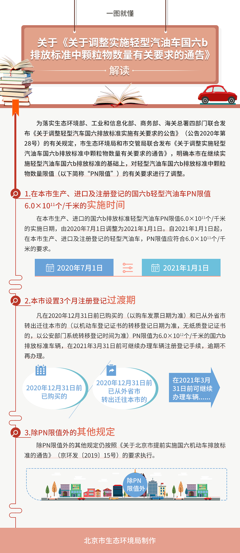 《通告》中表示,按照生态环境部、工业和信息化部、商务部、海关总署四部门联合发布《关于调整轻型汽车国六排放标准实施有关要求的公告》(公告2020年第28号)的有关规定,北京市将在继续实施轻型汽油车国六b排放标准的基础上,对轻型汽油车国六b排放标准中颗粒物数量限值(以下简称“PN限值”)的实施要求进行调整。