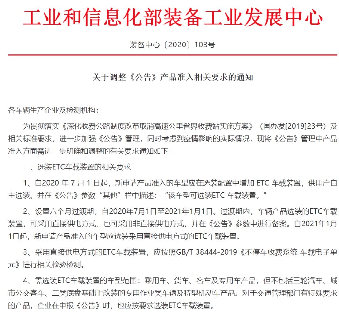 给您提完醒,接下来咱们再来聊聊ETC的新规定。最近,我看到有关部门正式发布了关于ETC的《公告》,内容见下图。简单来说就是自2020年7月1日开始,国内销售的新车都将提供ETC配置的选装,您可以在买新车的时候,自由选择是否提前安装ETC。