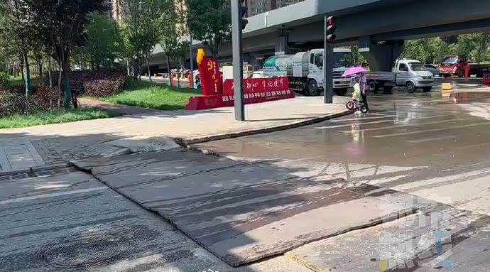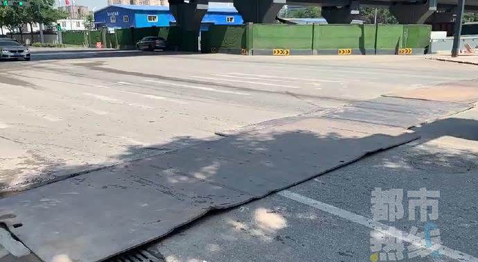 现场看到,在这个十字路口,新开门桥正在施工,施工方在十字路口挖了一个线沟,用钢板覆盖,但是因为其中一块钢板不知何因出现了一个超过15公分的翘脚,赵师傅行驶到这里时,车辆就是被这个翘脚刮损的。