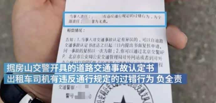 最终,因出租车有违反通行规定的过错行为,房山交警判定该出租车司机负全责。