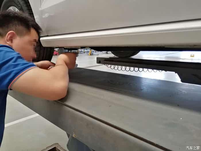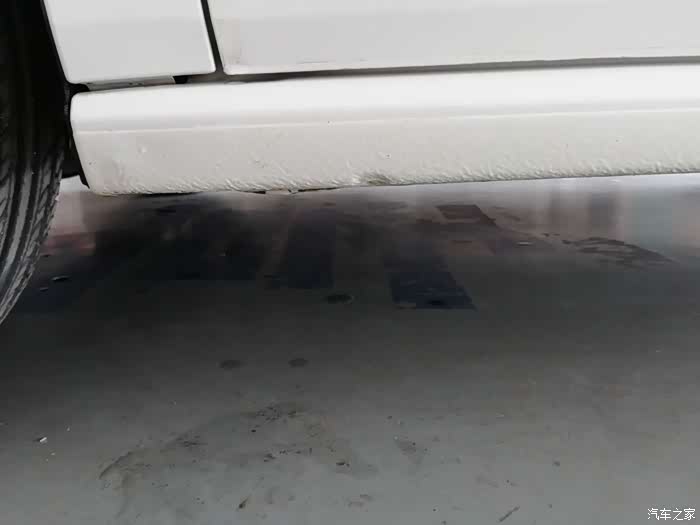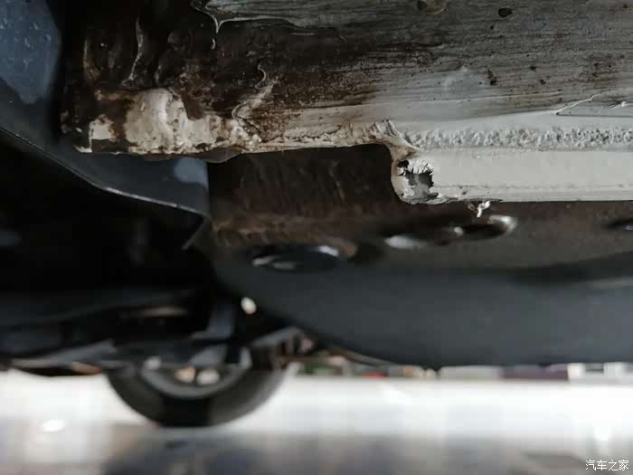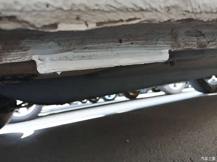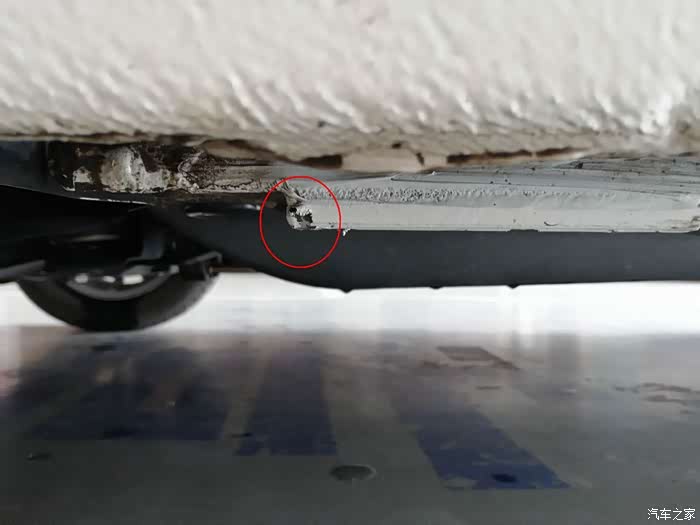 看起来应该是前阵子做保养时候被硌坏了,好在问题不大,一会儿让师傅给点点漆就好了。