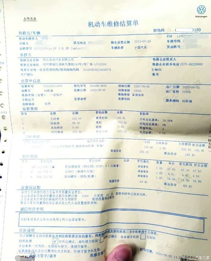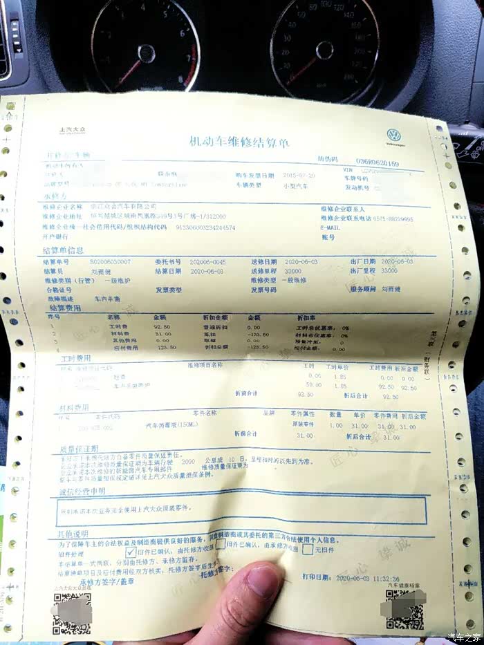最后结算环节,机油自带,工时打7折,消毒免费,十分满意。本次6保和消毒服务体验到此结束,感谢车友们指正。