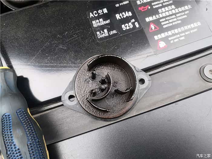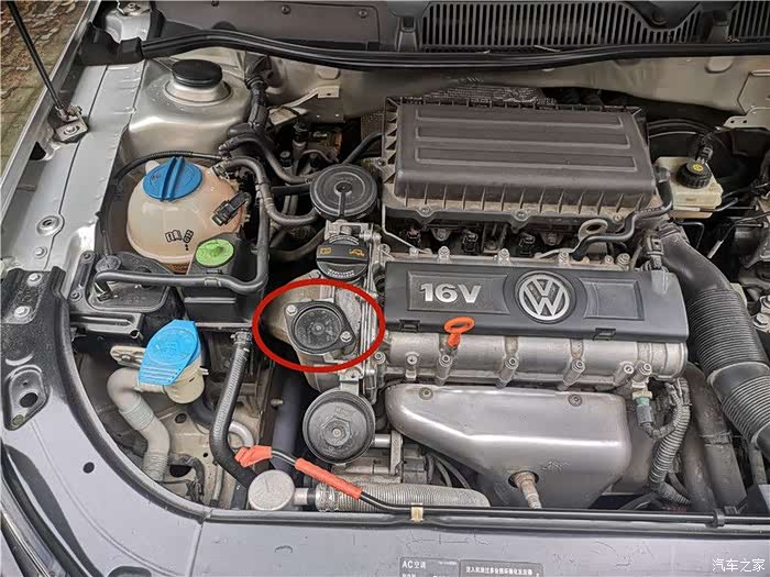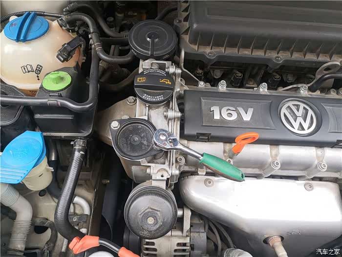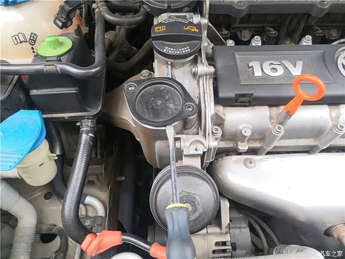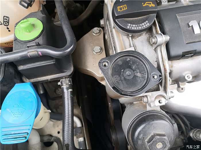 打开发动机舱,主要就是检修油气分离器情况,也就是圈中物件。