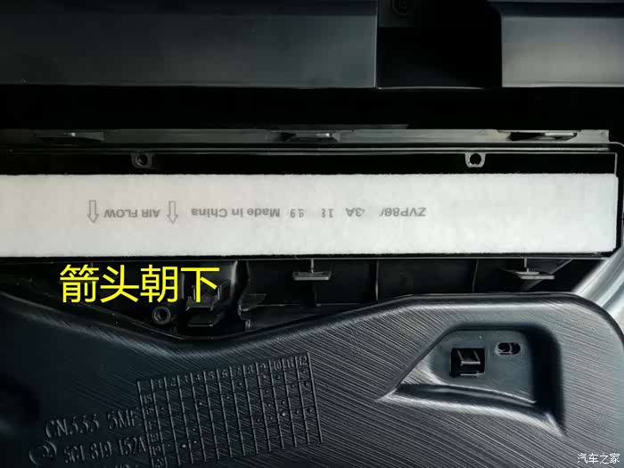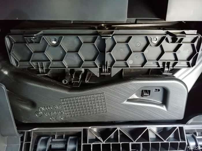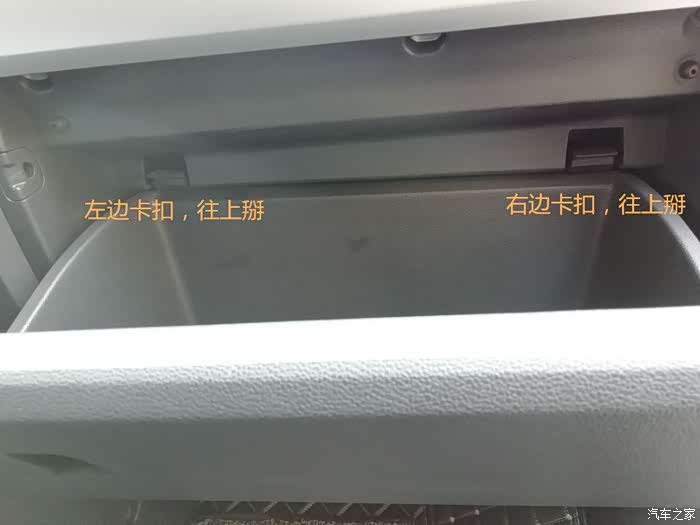 打开手套箱,找到两个卡扣,适当用点力把卡扣向上掰,手套箱就会完全放下来,空调滤芯盖板就完全露出来了。