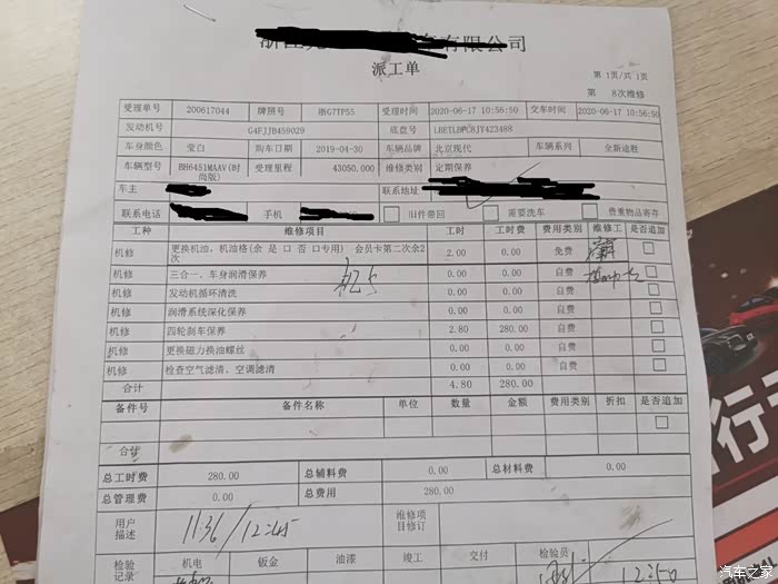 最后附上今天保养的结算单,一共花了280元,基本保养是之前办了会员卡送的,当时活动的时候办卡贰仟不到 一共送了五次基本保养,还有一些其他项目,还是很划算的。怕你们说我打广告,我把店名都打马赛克了。