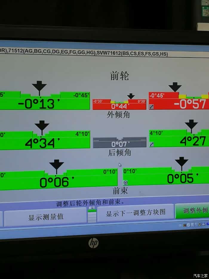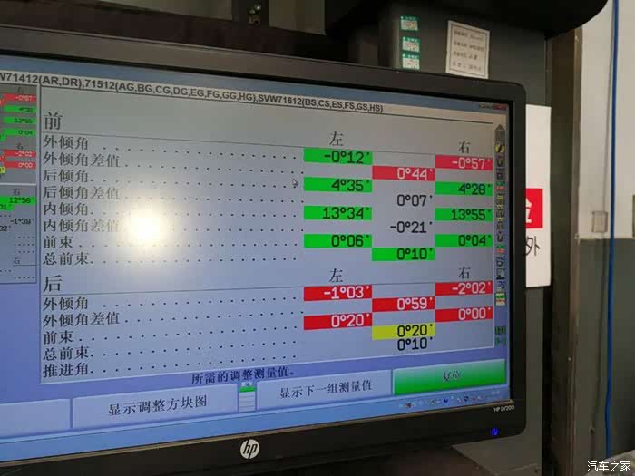 看到论坛上有车友说,显示器上的结果全是绿色的,我的还有红色的。问师傅,师傅说:一个是只能调前轮,不像其他车型可以调后轮;其次,这些数据能保证在安全范围内。我拍照“留念”了。发出来让懂车帝看一下。最后的一张是最终保存数据。