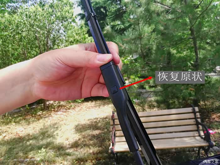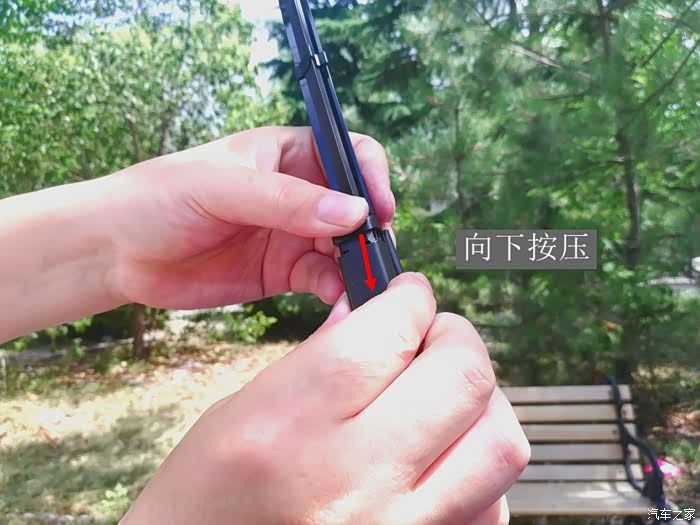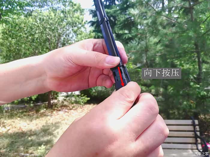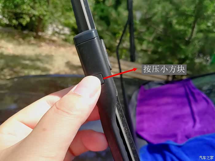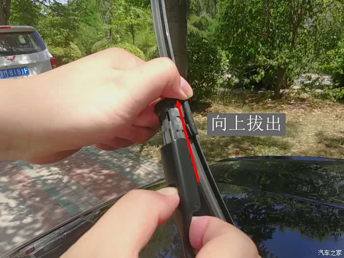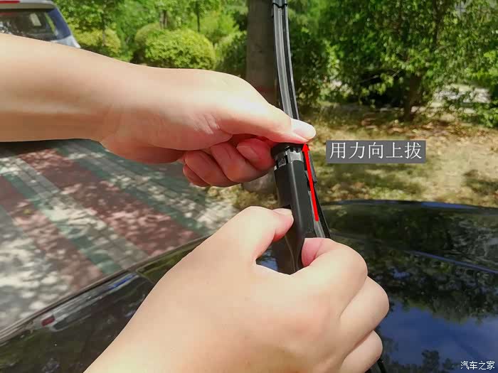 第二步是拆卸旧的雨刮器了。拆卸雨刮时先用手指按住雨刮器与雨刮杆接口处的小方块,然后用另一只手用力往上方拔,这样就可以将旧的雨刮器顺利的拆卸下来,不费一丝力气、不耗太多时间,简单、方便又快捷。
