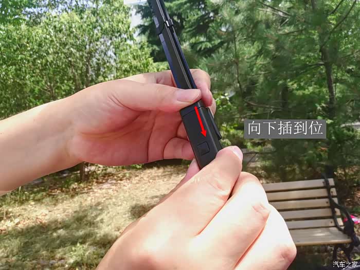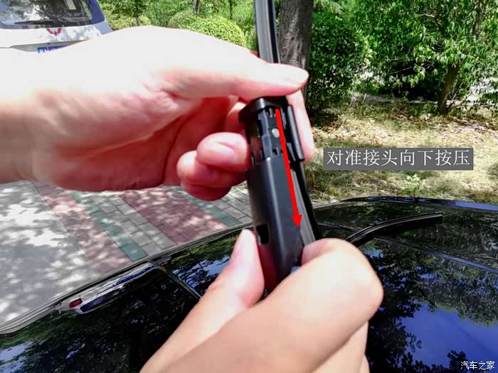 安装时的方法也很简单,操作时将新雨刮器的接口处对准雨刮杆的接口槽,用力往下一插直至两者接口处的小方块完全弹起恢复初始即可安装完毕,同样的方法安装好另一侧的雨刮器。