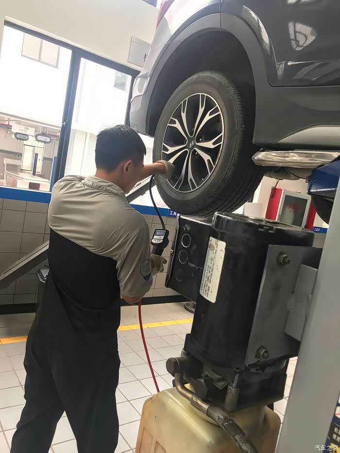 经常自驾游,轮胎磨损会厉害一点,师傅在认真检查我的轮胎