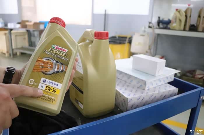 这就是这次保养要换的补品啦,日常小保养,所以换的是上汽专享的嘉实多5w-30的机油,总共要加4.5升,所以一大桶一小桶,还有三滤
