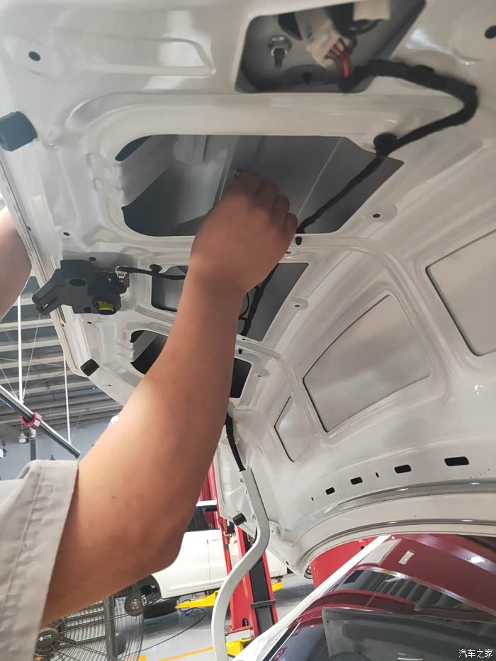 都扣开后慢慢取出装饰亮条,需要注意的是因为GX 的后备箱开始按钮是固定在装饰亮条上的,所以一定记得先去掉行李箱开启线束插口。