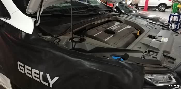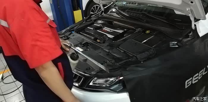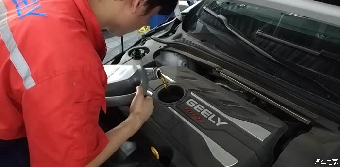 机油加完,检查已经到正常刻度以后,售后师傅在认真的清洗发动机舱盖。