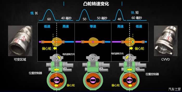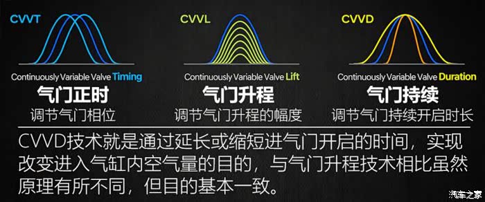 本质上,CVVD是结合了CVVT和CVVL两种特色,它既可以改变气门的开关时间节点,又能够改变气门的升程,大幅度提高发动机的性能,并且加入了“可持续变化期”的新概念。