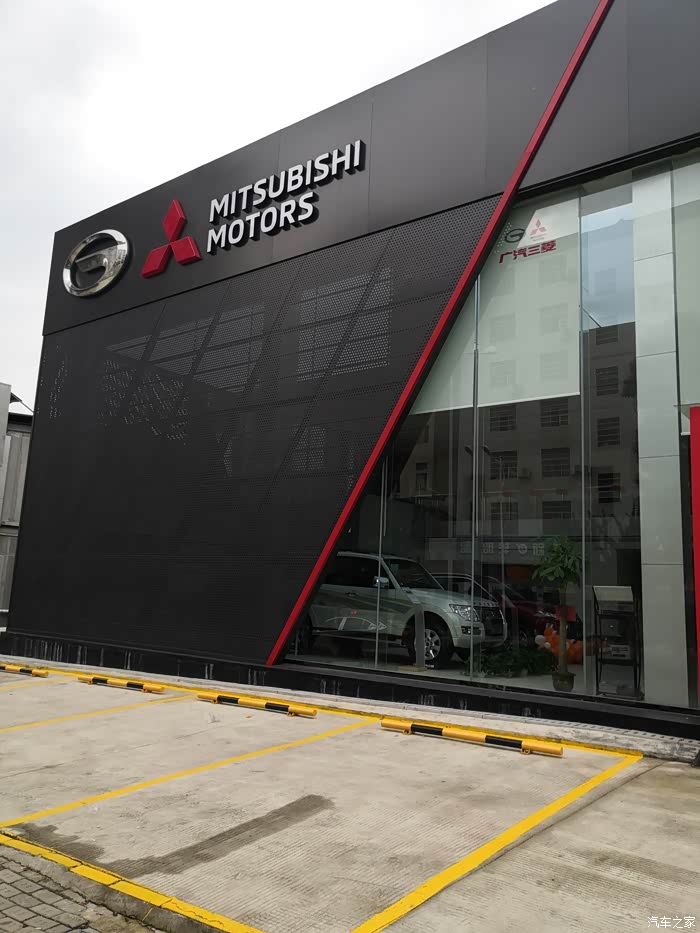 这是一家新装修的广汽三菱4S店,外形显得有些高档,感觉比以前的店面好看多了。