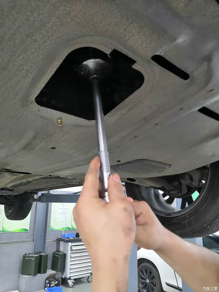 把发动机油螺丝盖拧开准备放出旧机油。
