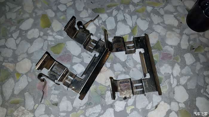 刹车片和卡簧上面都是刹车碎粉末,清理一下。刹车片也磨一下边边因为刹车的时候产生啸叫声。