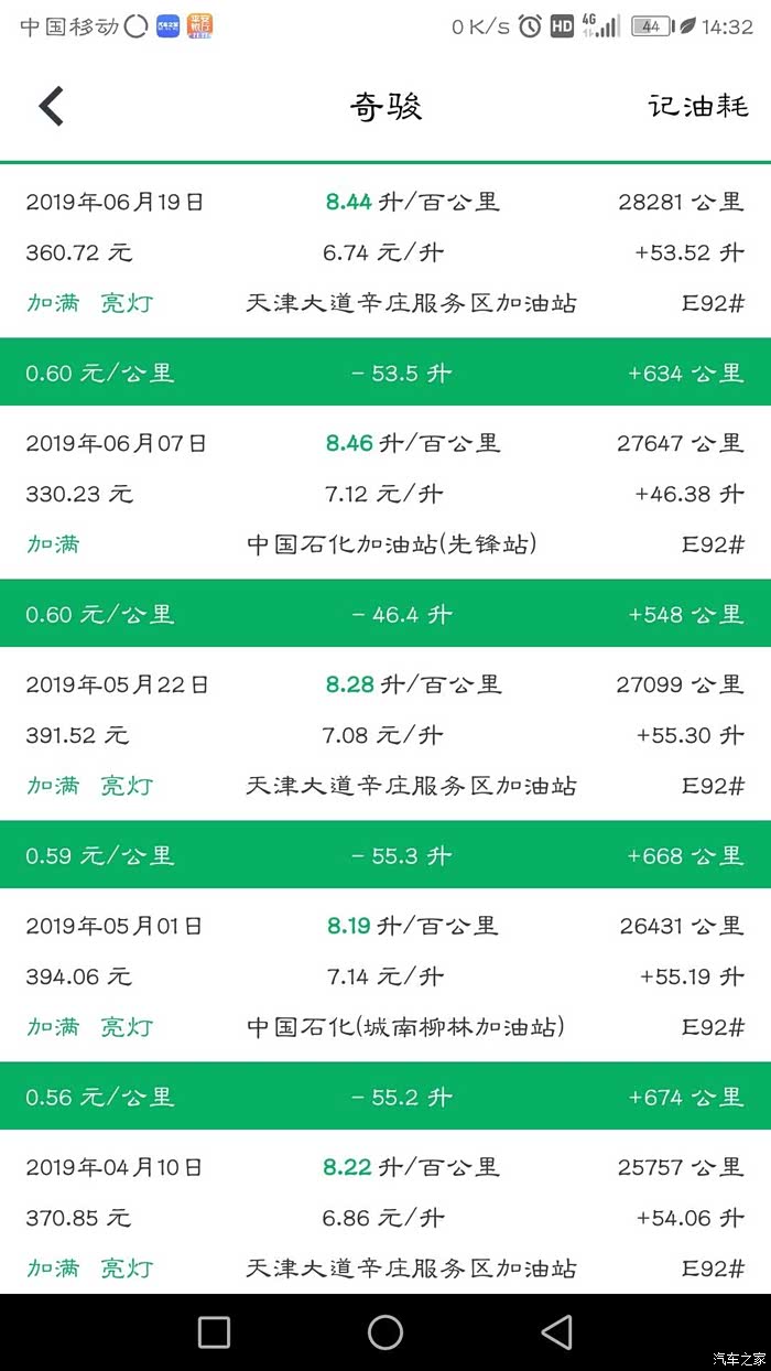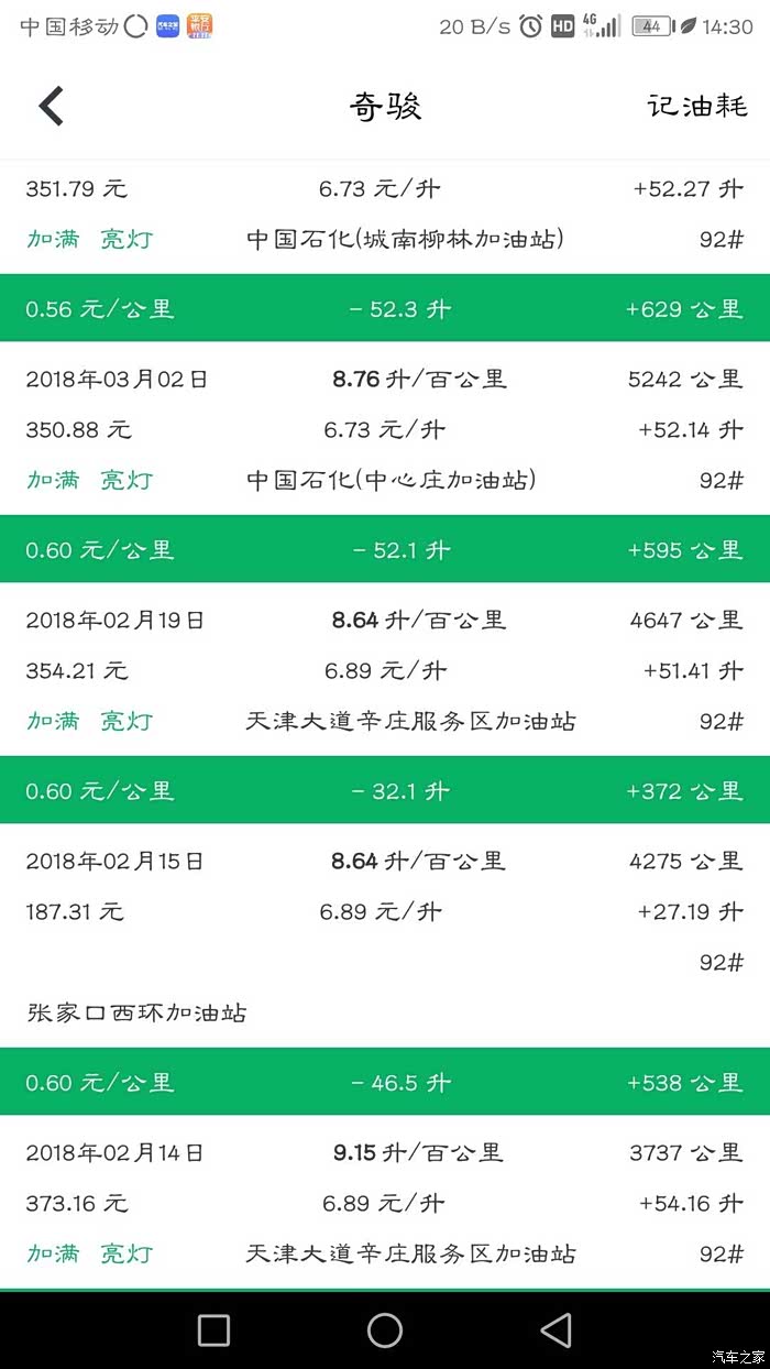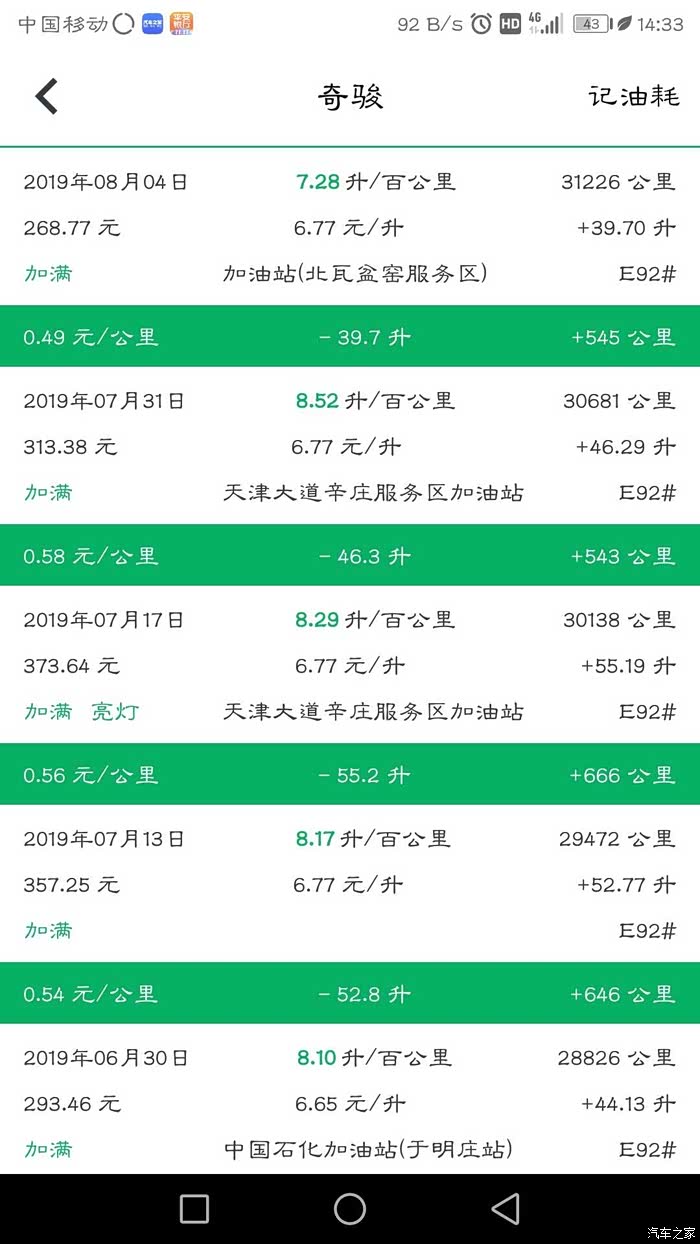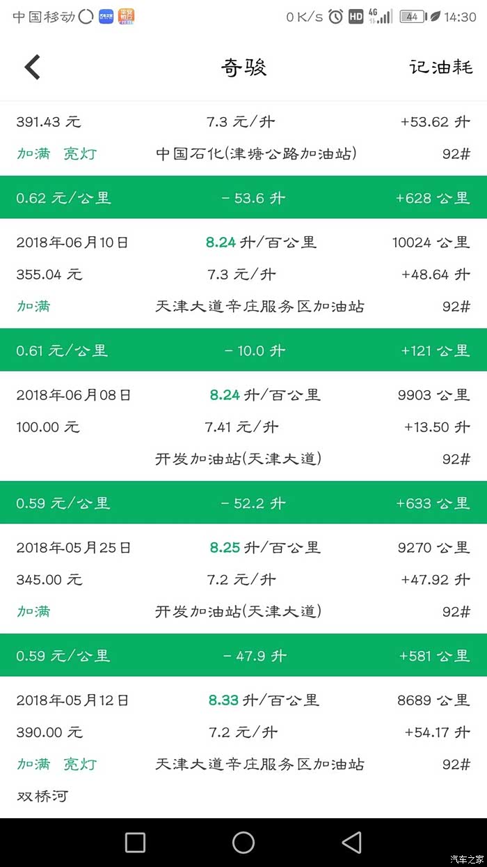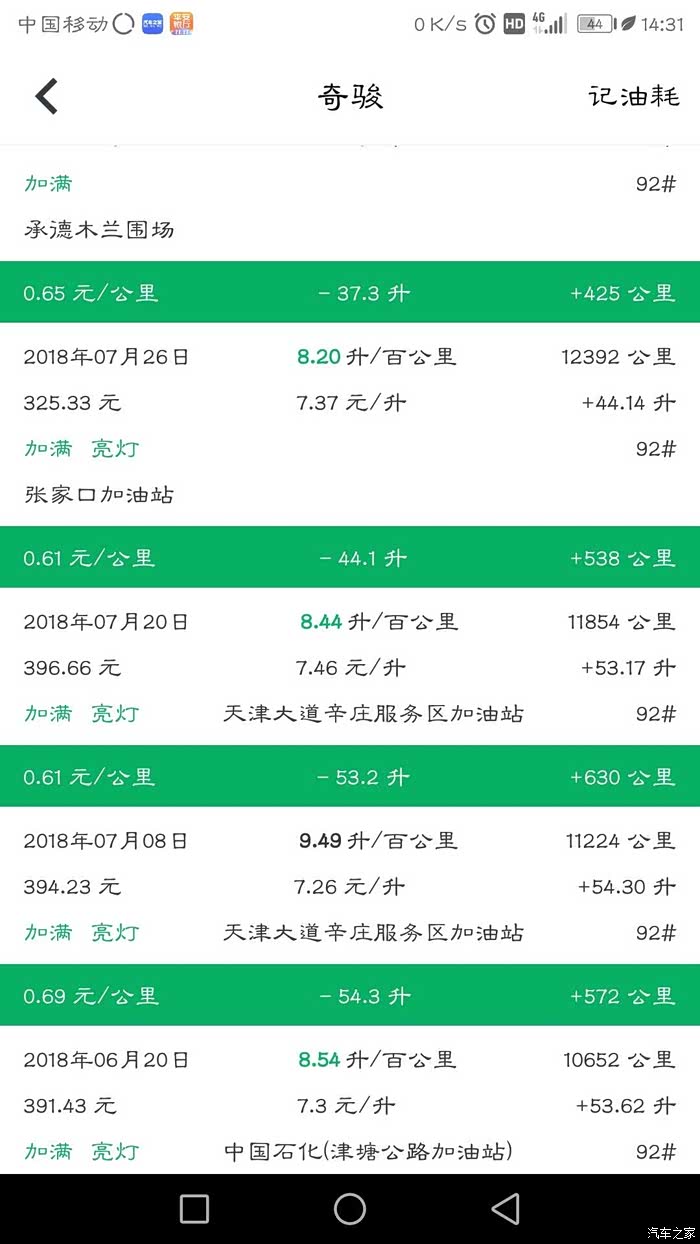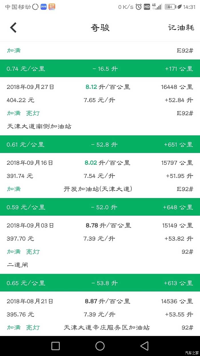 相信很多朋友在购车前都会关注车的一个重要参数就是油耗,特别是对于想购入车辆的油耗很是关心,在论坛里也见到不少人问这个问题,也有很多车友回答这个问题。我在换车前就是因为原来1.4排量的标致207动力实在太弱,所以想买一个大排量的,最初国产车里锁定了长城哈弗H6蓝标2.0T车型,试驾了几次感觉挺好,合资车里锁定了JEEP指南者和奇骏,据很多车友说长城的车特别费油,油耗得十一二个了,奇骏官方数据是7.6L/百公里,而且我一个同学买的是2014款2.5豪华版奇骏说油耗大概9个吧,我想油耗只要控制在10个以内我就可以接受,最后买了奇骏2.5豪华版,购车后就做了一些个统计记录验证真实油耗,分享给大家参考。
