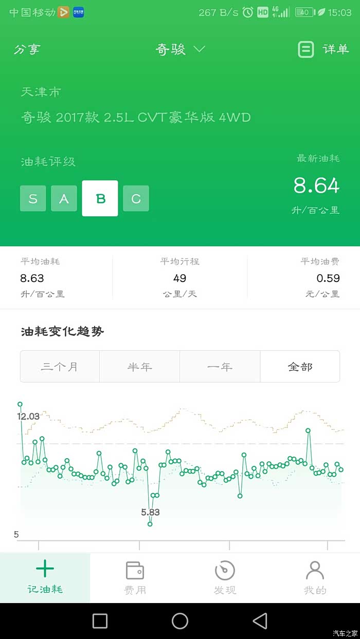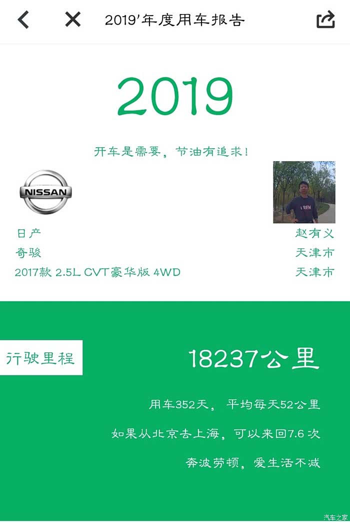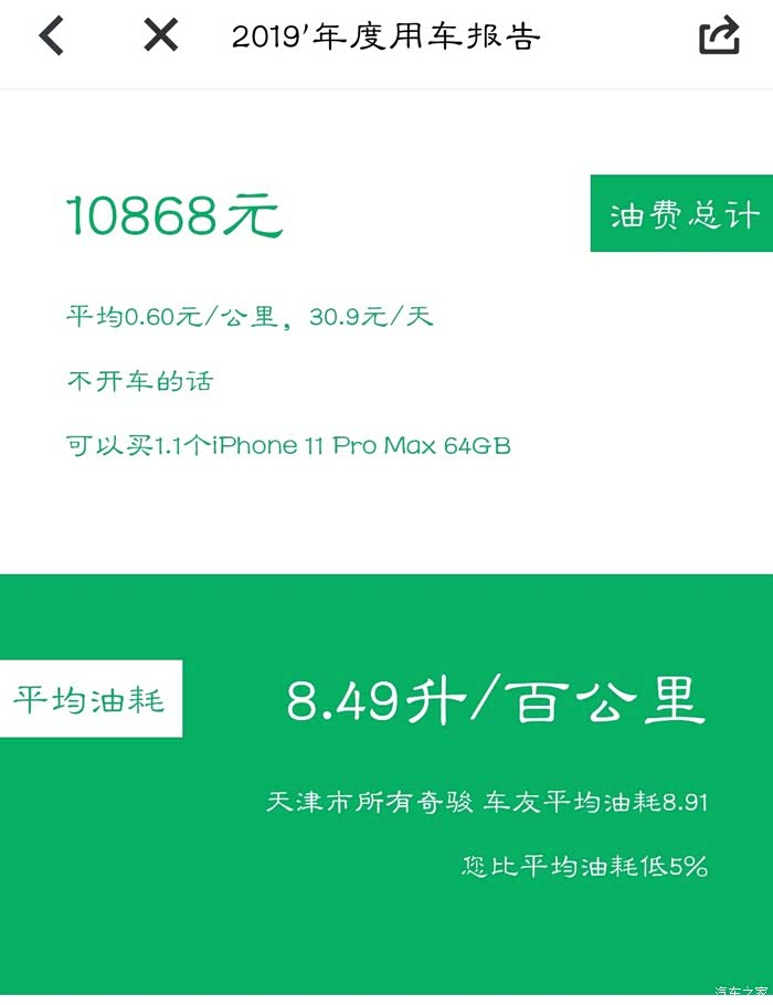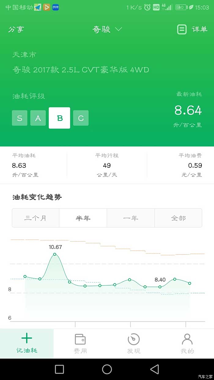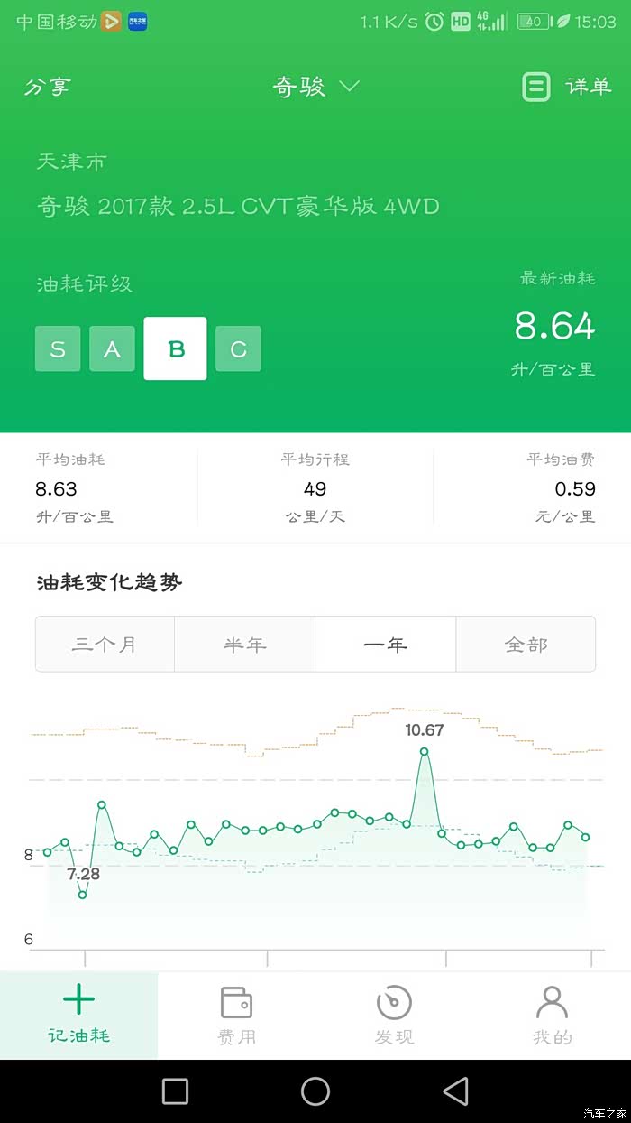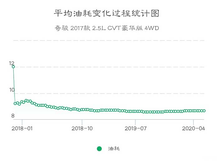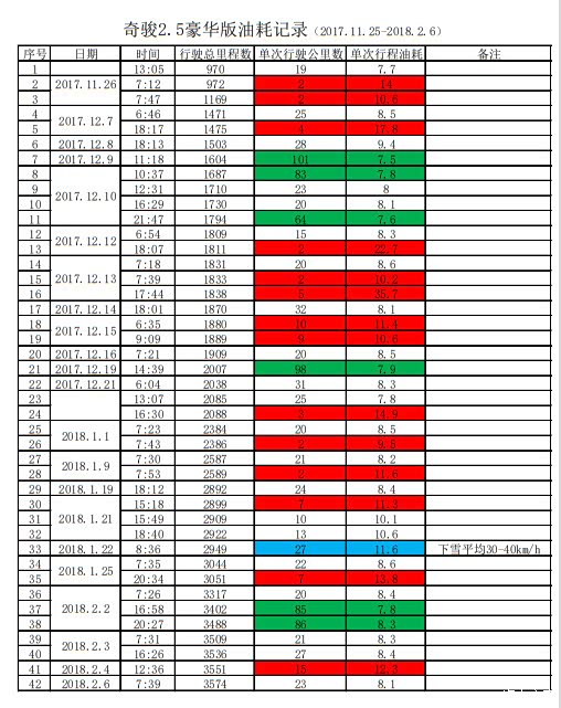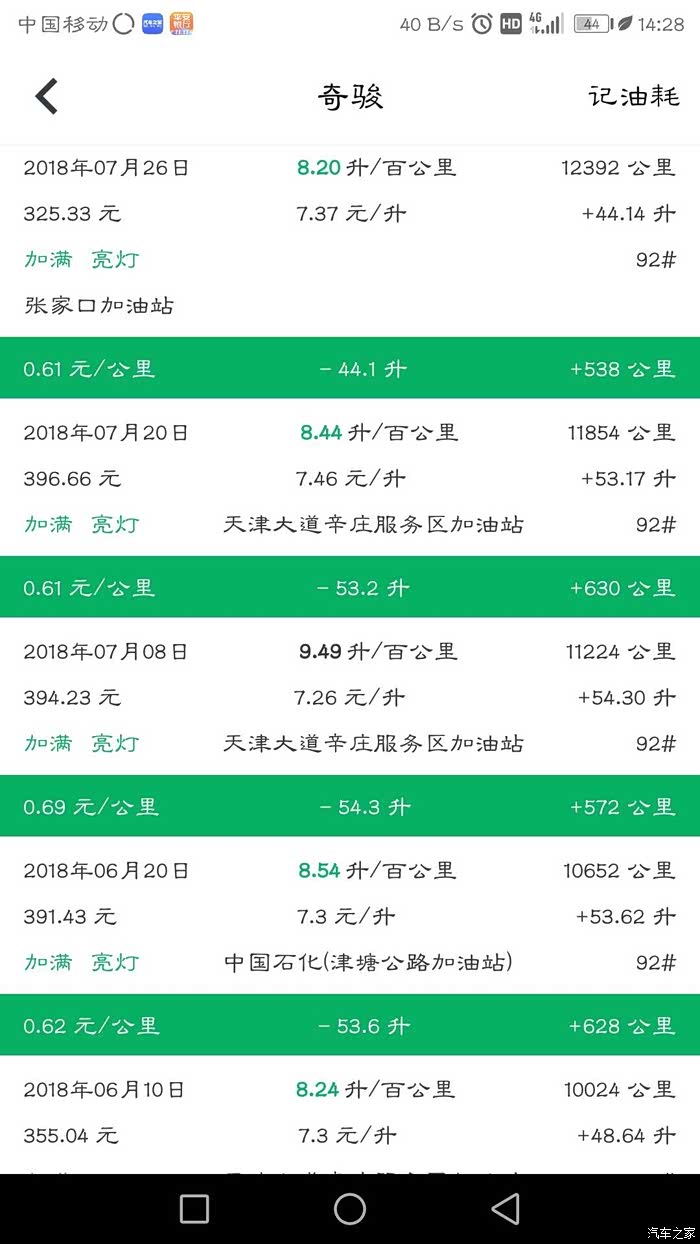 相信很多朋友在购车前都会关注车的一个重要参数就是油耗,特别是对于想购入车辆的油耗很是关心,在论坛里也见到不少人问这个问题,也有很多车友回答这个问题。我在换车前就是因为原来1.4排量的标致207动力实在太弱,所以想买一个大排量的,最初国产车里锁定了长城哈弗H6蓝标2.0T车型,试驾了几次感觉挺好,合资车里锁定了JEEP指南者和奇骏,据很多车友说长城的车特别费油,油耗得十一二个了,奇骏官方数据是7.6L/百公里,而且我一个同学买的是2014款2.5豪华版奇骏说油耗大概9个吧,我想油耗只要控制在10个以内我就可以接受,最后买了奇骏2.5豪华版,购车后就做了一些个统计记录验证真实油耗,分享给大家参考。