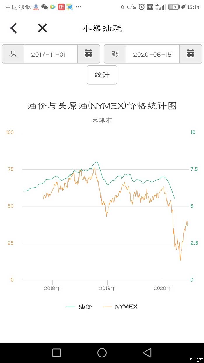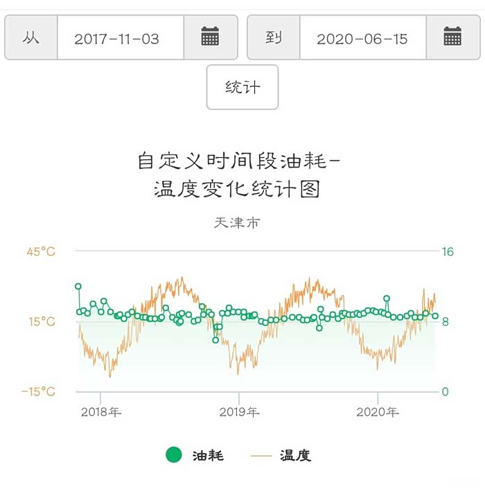从此图可以看出油耗和温度还是有一定关系的,温度偏低时油耗偏高,温度高一些时油耗还是相对较低的。