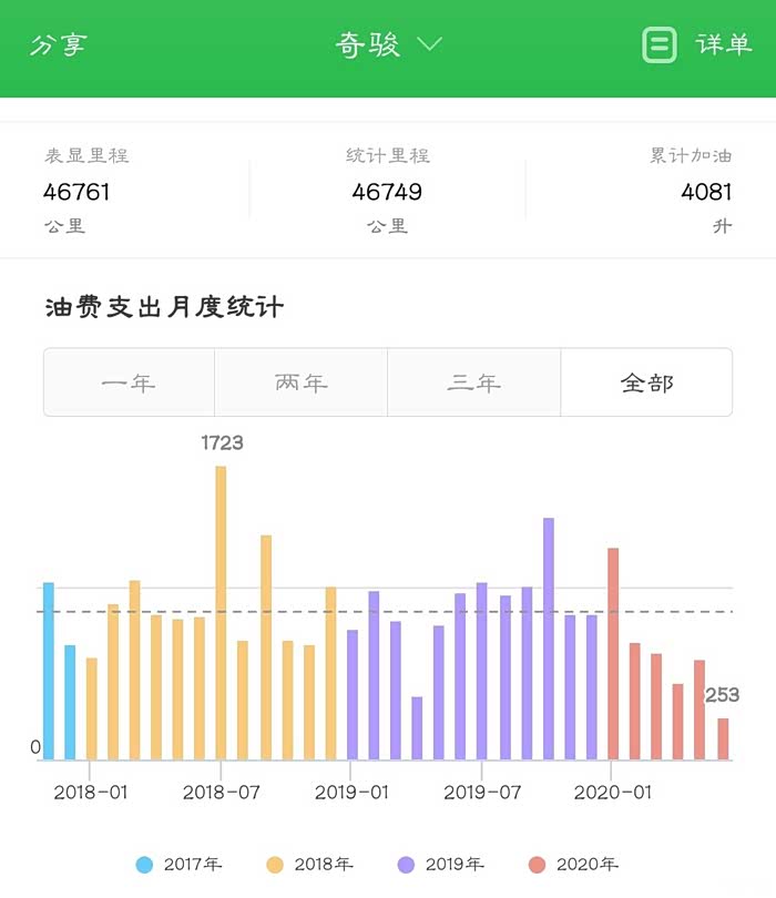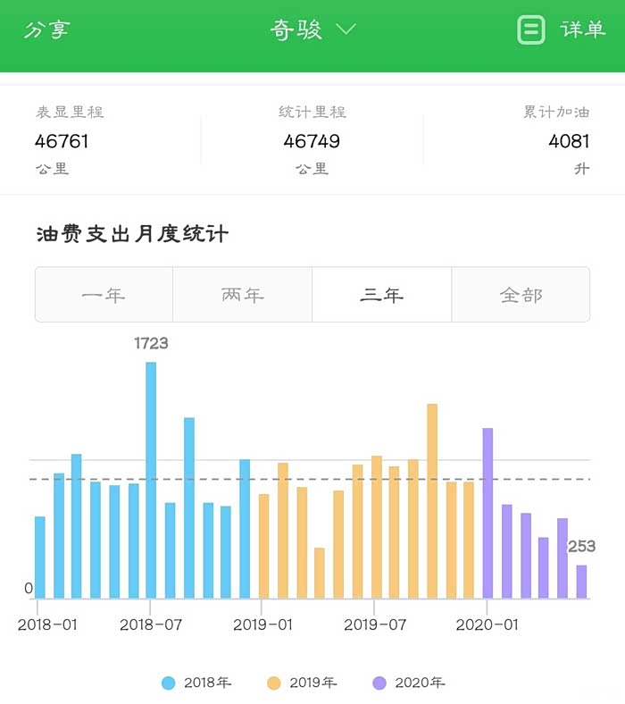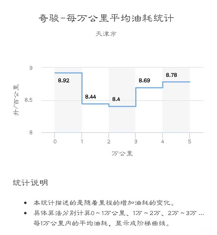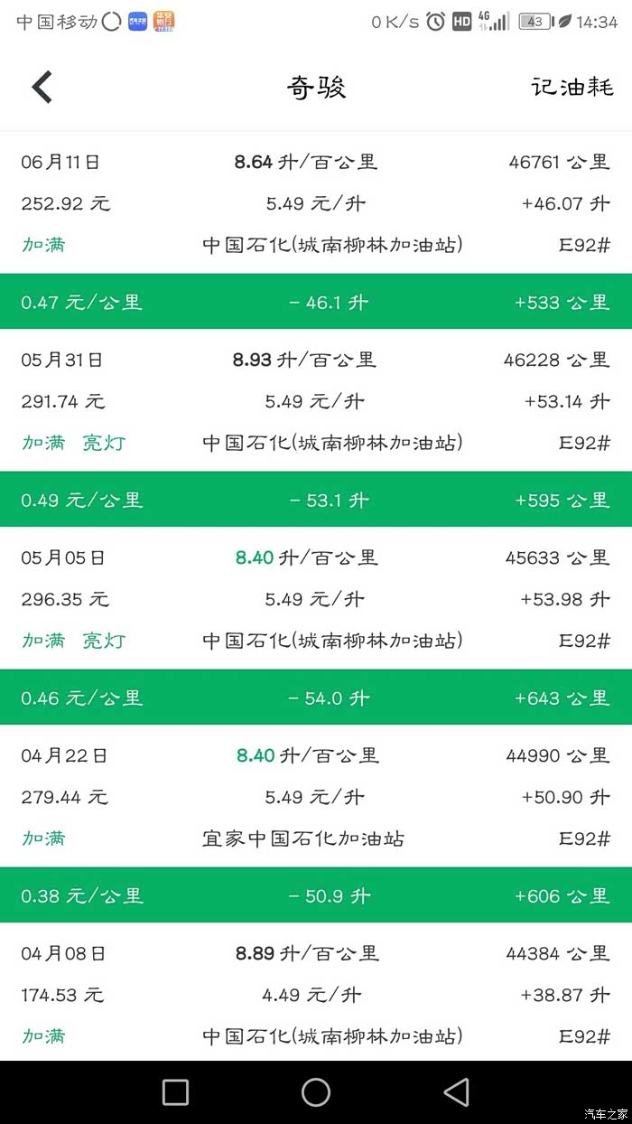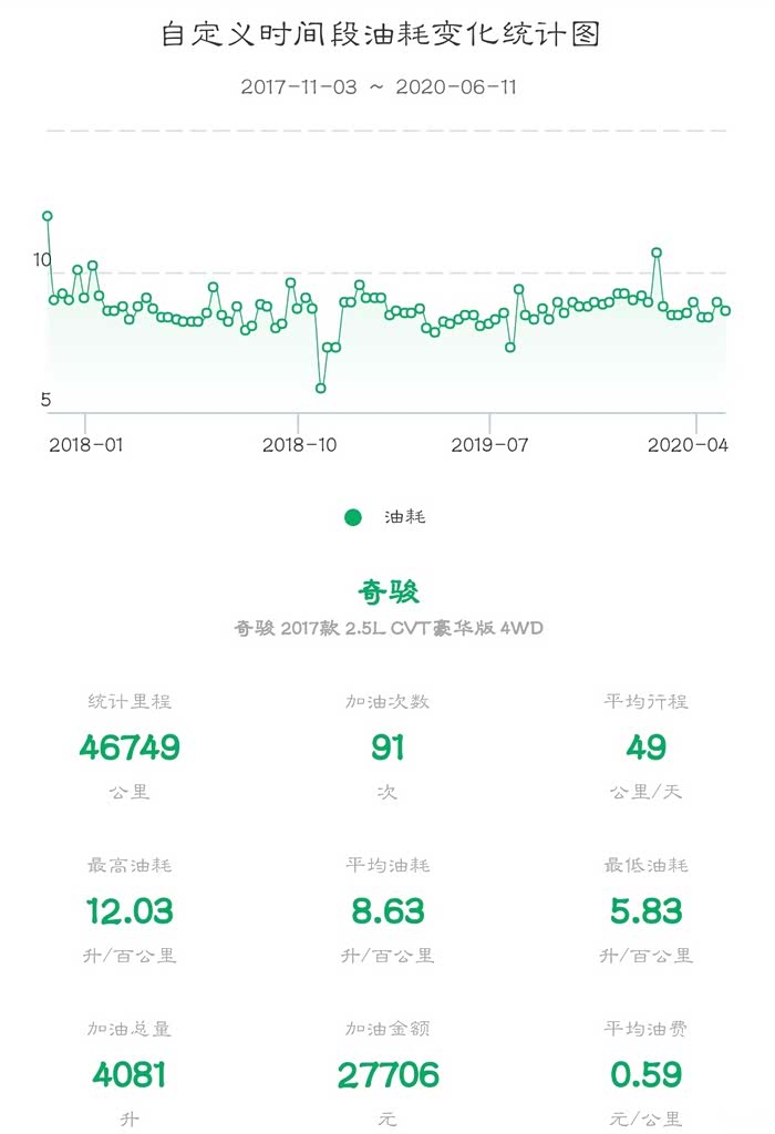 截止目前我的奇骏陪我度过了2年零7个月,行驶了46904Km,刚刚做了保养。统计油耗行驶46761公里,平均每天是49公里,实际油耗是8.63升每百公里,这个是比较准确的了,而且这个值现在比较稳定,只要路况不发生大得变化,这个油耗基本锁定了,上下波动不大。表显平均油耗是8.2升每百公里,相差0.43升每百公里,这个偏差还可以接受。希望此文章能够给大家提供参考和帮助。