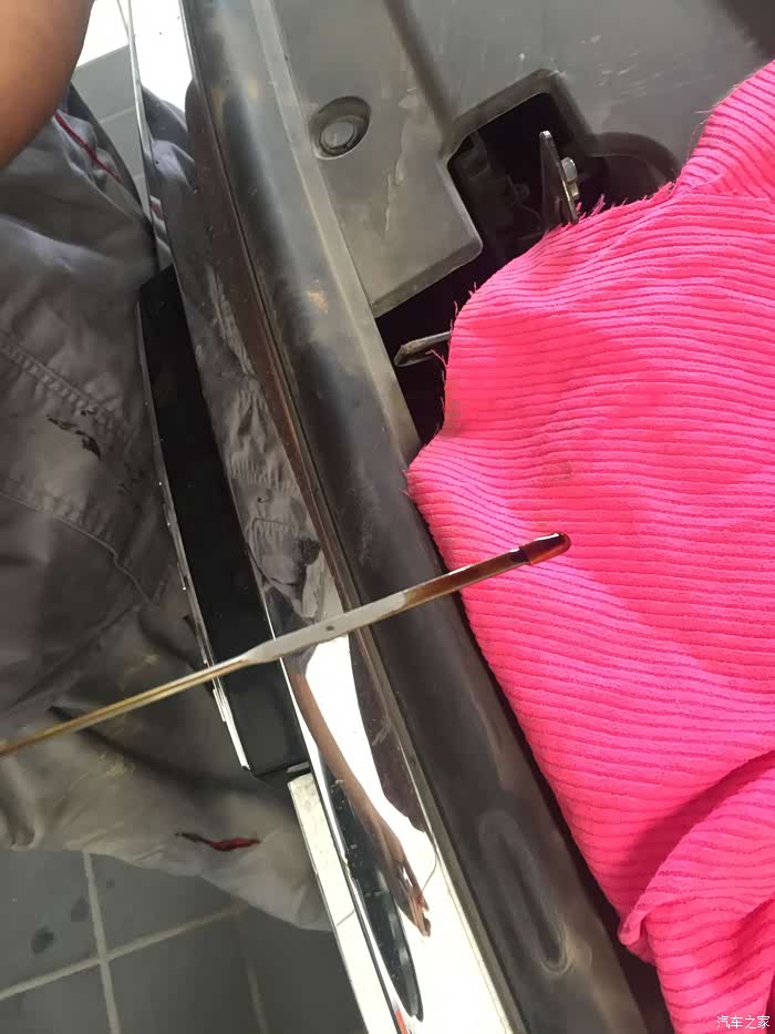 由于上一次保养已经做过机器循环换油,这一次就做普通重力换油即可,第一步检查机油刻度正中间,发动机工况良好。