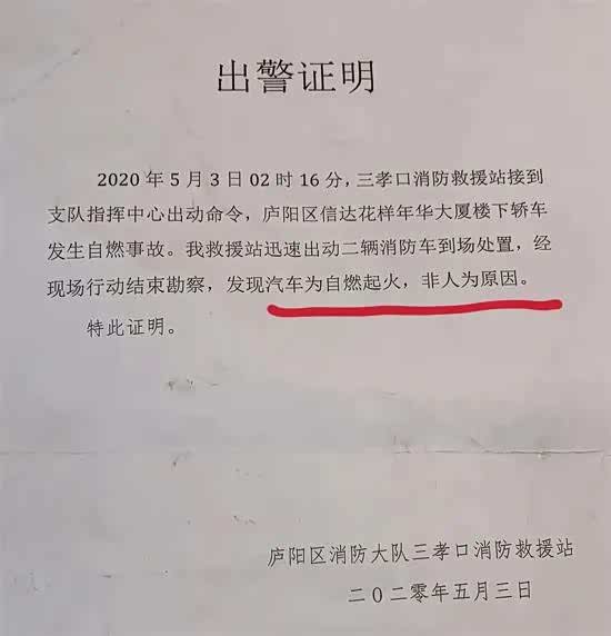 据提供的照片可见,车辆自燃情况被扑灭后,从外壳来看并没有受到太大损伤,但车辆内部已被完全烧毁,从前车的中控到车辆的后排座椅均被烧的破烂不堪。于是周先生也进行报警处理,在消防队赶来处理后,消防部门出具了一份证明:发现车辆为自燃,非人为纵火。