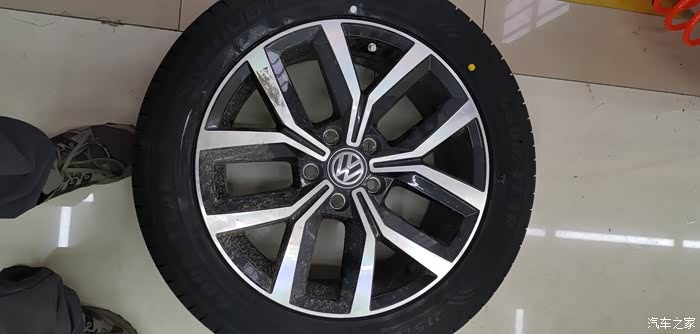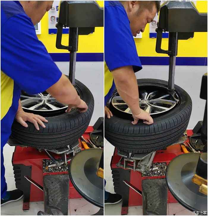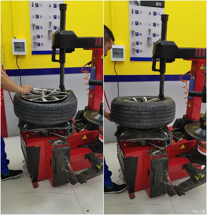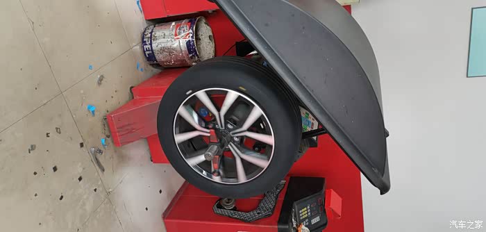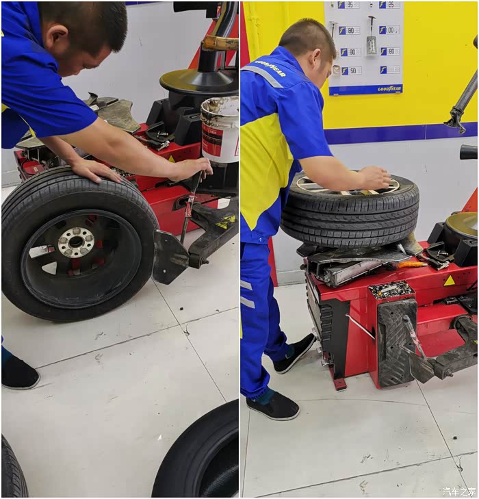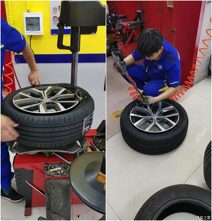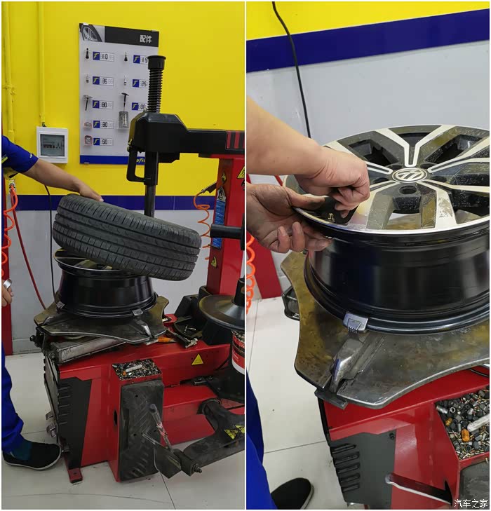 隔天提前联系过,所以到店就立马开上工位。老板娘亲自接待,经过简单沟通,取出四条包扎完好的新胎,卸下旧鞋,操作人员技术娴熟,装上新胎,还新换了同品牌的气芯,胎压2.5,然后做动平衡,装上蔚揽。