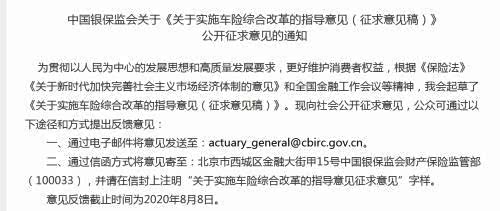 银保监会9日发布《关于实施车险综合改革的指导意见(征求意见稿)》,向社会公开征求意见,意见反馈截止时间为2020年8月8日。征求意见稿明确,提升商车险责任限额,结合经济社会发展水平,支持行业将示范产品商业三责险责任限额从5万-500万元档次提升到10万-1000万元档次,满足消费者风险保障需求。