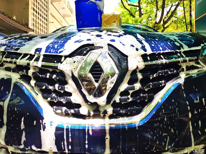洗车海绵沾上泡沫以后涂抹上雷诺车标上。