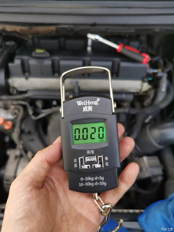 上次安装的点,号称原厂的,百思不得其姐,难道安装松了?这次,用上了传说中的扭力扳手神器:弹簧秤,算了一下10牛米,力矩17.5CM差不多5.8千克,耐心装完,两个小时没发动,希望不漏。