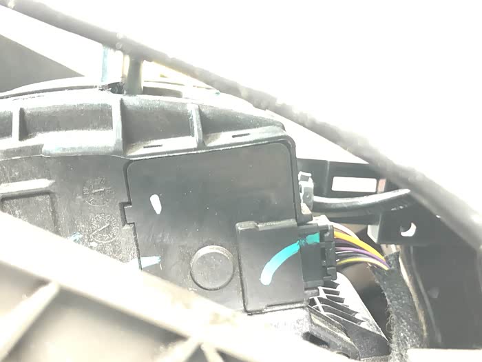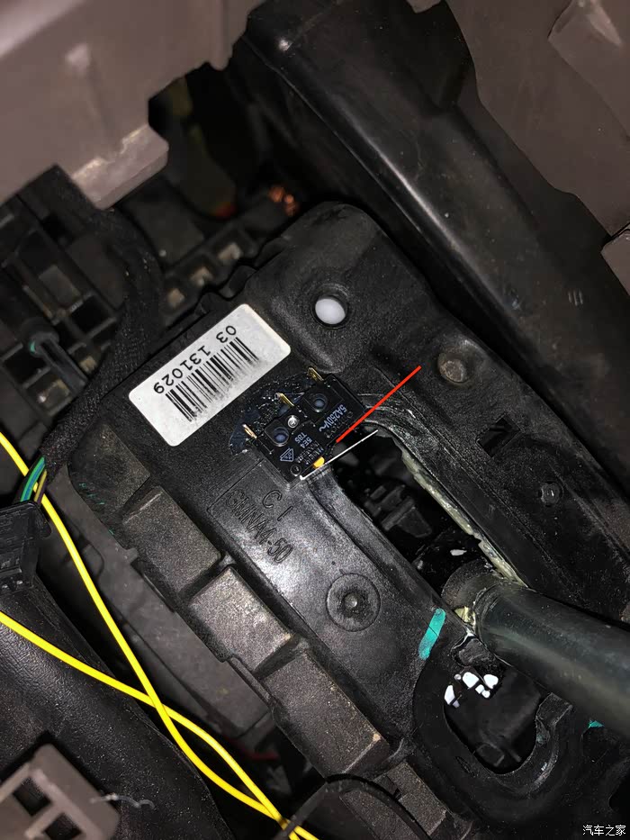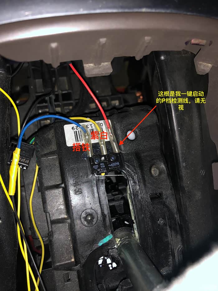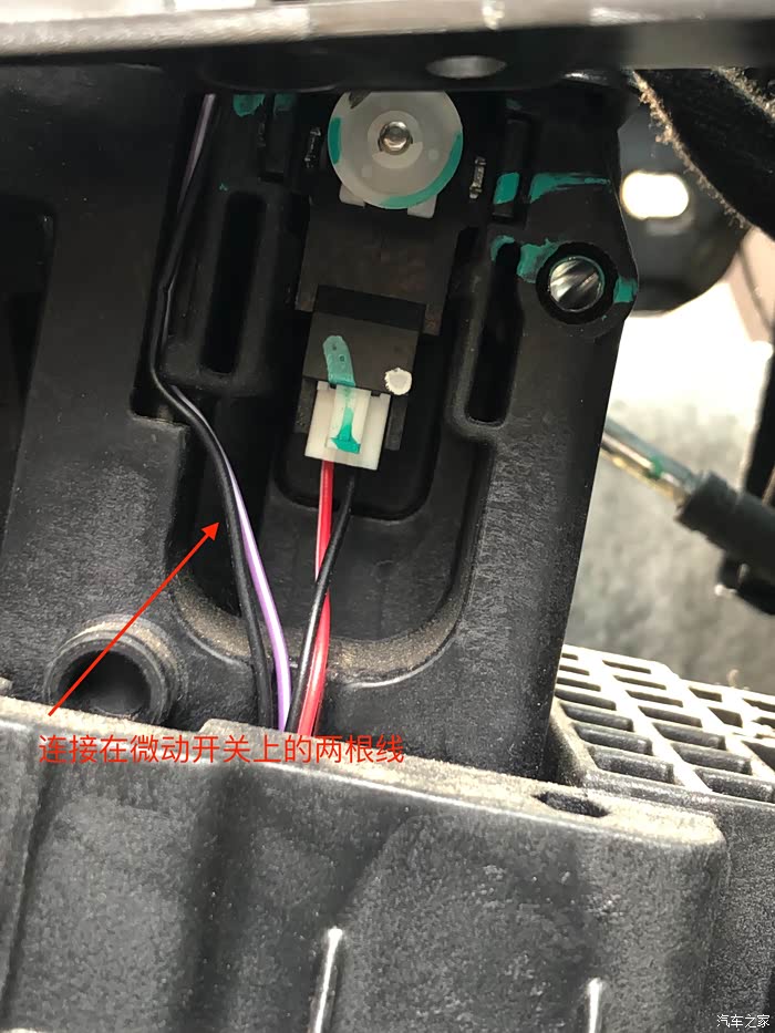 近距离看一下,记住两根线的颜色,黑然和紫白,一般两讲黑然都是搭铁的,这里先告诉大家吧,经过我的测试这根黑色就是搭铁线。上面这张照片再往上的视角我就没照了,顺着微动开关的线往里看是看到微动开关的全貌的,只能看到其屁股,也就是说微动开关是在换档器总成里面的,我仔细环视了总成确定不把总成拆下来微动开关真的是拿不出来