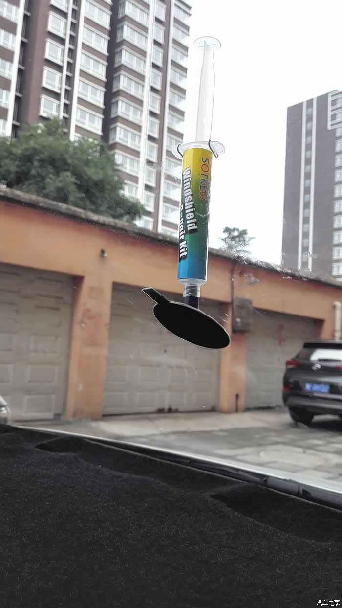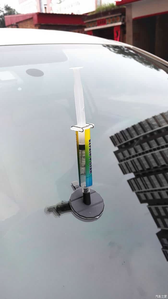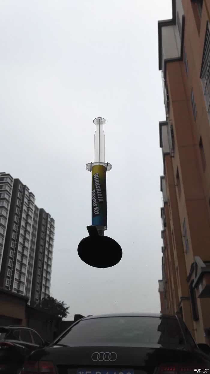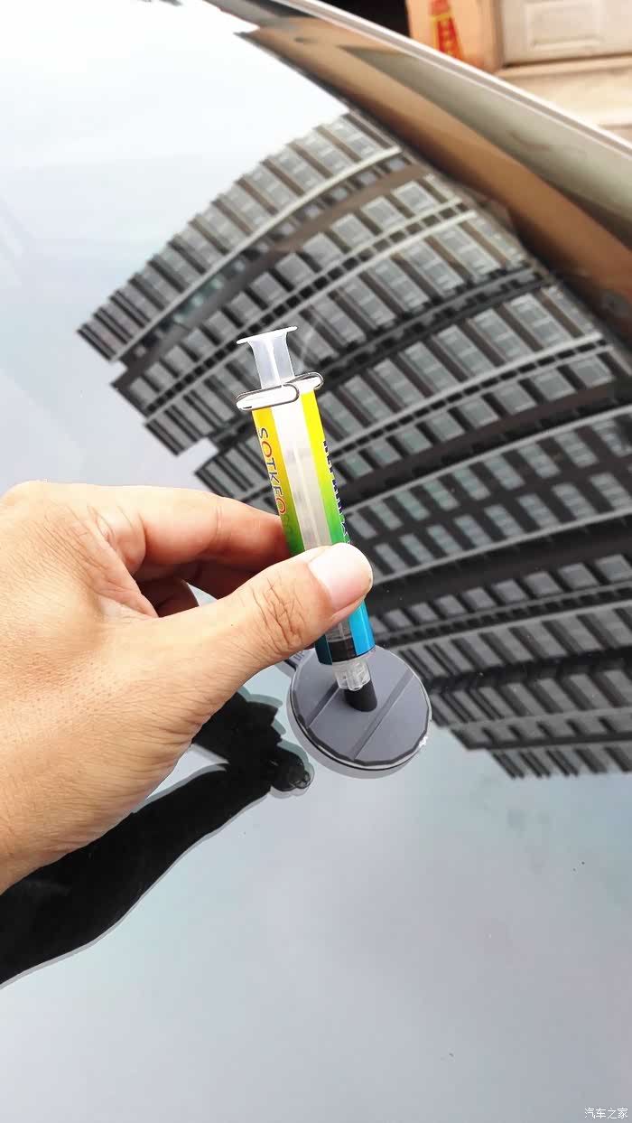 我的座驾以120迈的速度行走在京港澳高速公路望都路段上,被不知哪里飞来的石子击中打出一个小坑。车开回来后,咨询了好哥们问怎么办呀,以前知道他在保定也修复过他的爱车玻璃。得到的答复是:“你自己也能修呀。”我的天,我怎么不知道呀,呵呵。那就试一试吧。说干就干,从网上买的玻璃修复液套件,二十多元还包邮,还行。今天不下雨了,开工吧。原先哥们就告诉过我,如果让小石子砸了,首先要想到用宽胶带粘上,以免进去尘土,而且越是新茬越好做。这一招,还真用上了。