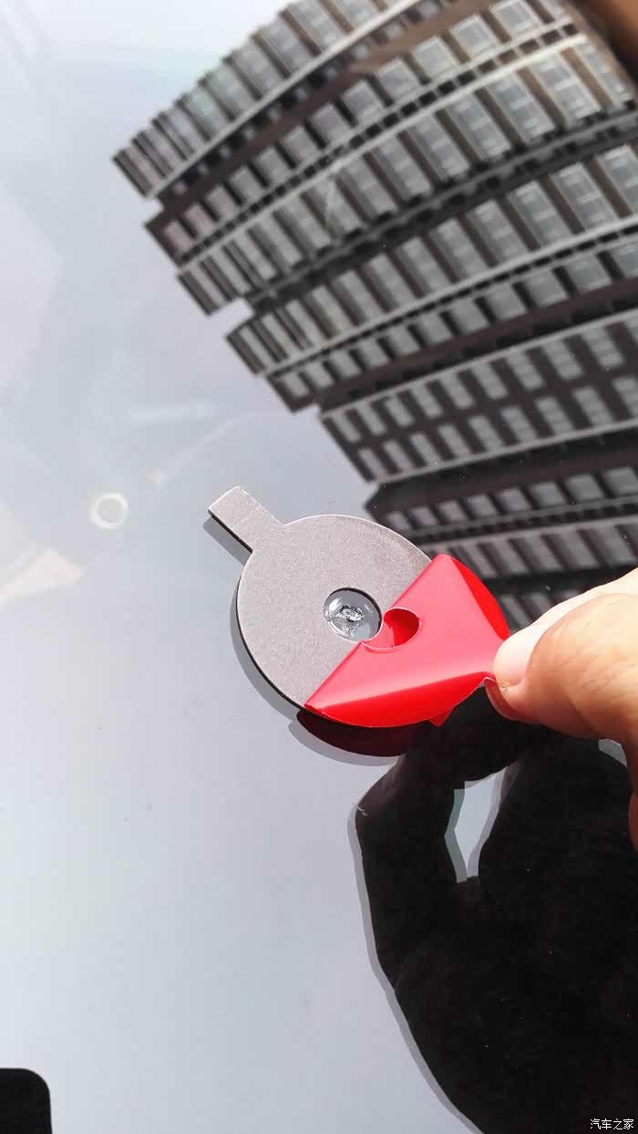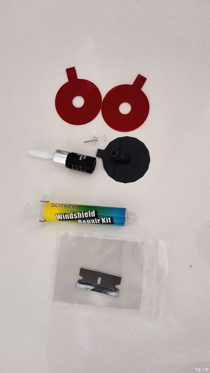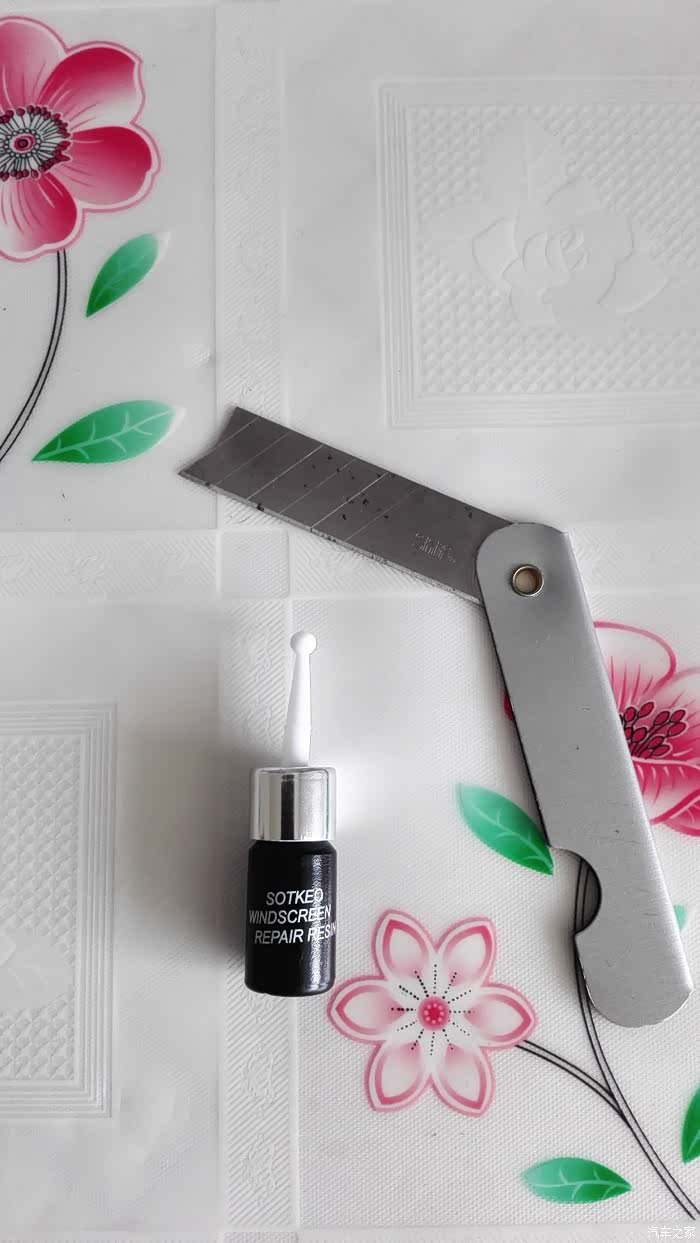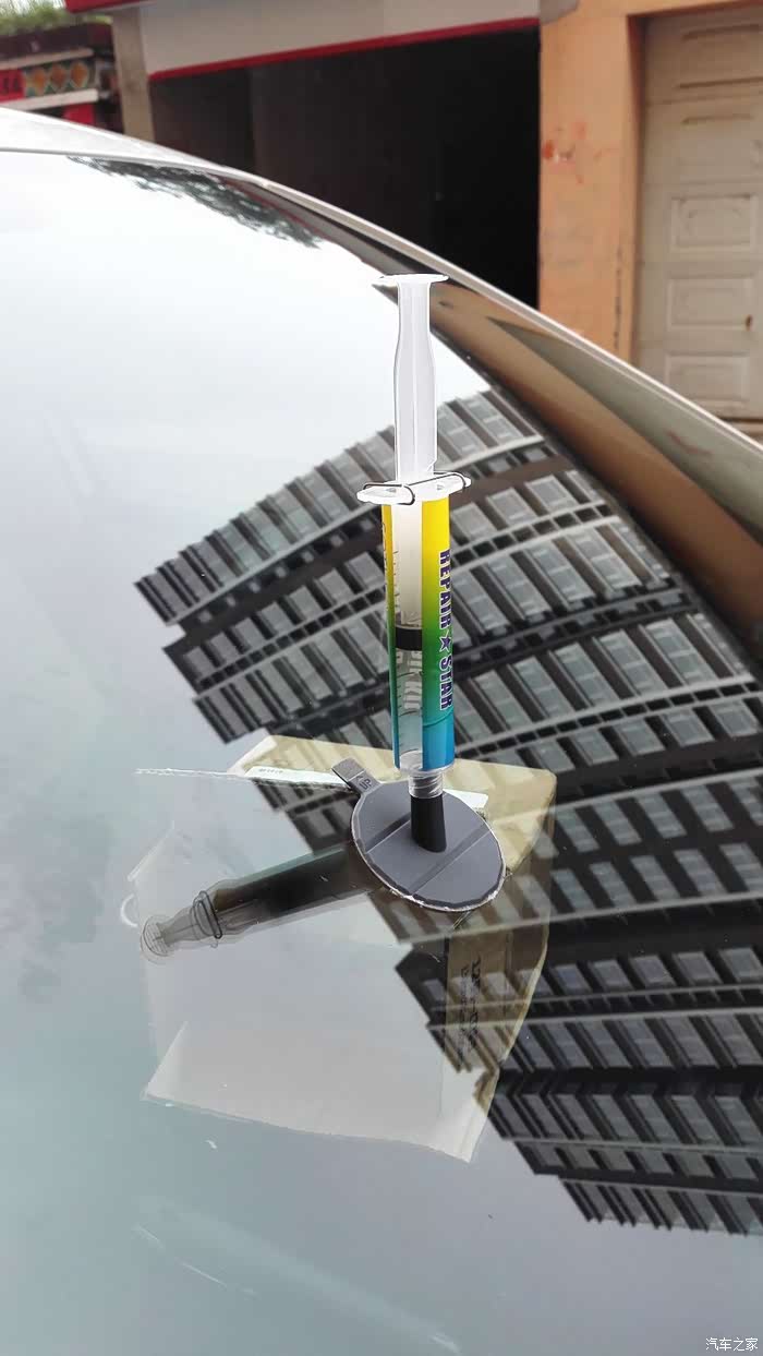 我的座驾以120迈的速度行走在京港澳高速公路望都路段上,被不知哪里飞来的石子击中打出一个小坑。车开回来后,咨询了好哥们问怎么办呀,以前知道他在保定也修复过他的爱车玻璃。得到的答复是:“你自己也能修呀。”我的天,我怎么不知道呀,呵呵。那就试一试吧。说干就干,从网上买的玻璃修复液套件,二十多元还包邮,还行。今天不下雨了,开工吧。原先哥们就告诉过我,如果让小石子砸了,首先要想到用宽胶带粘上,以免进去尘土,而且越是新茬越好做。这一招,还真用上了。