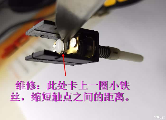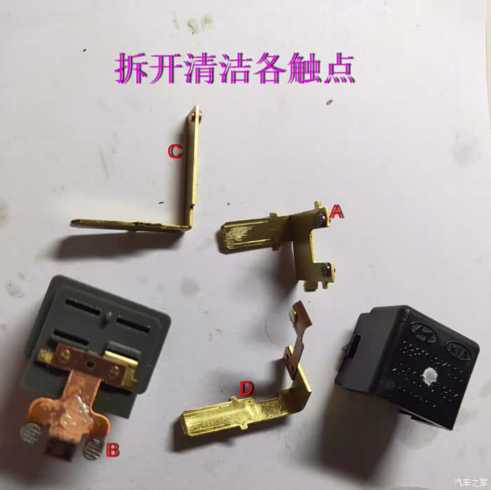 清洁各部件,把B件和D件的铜片稍折弯一点以压紧触点。