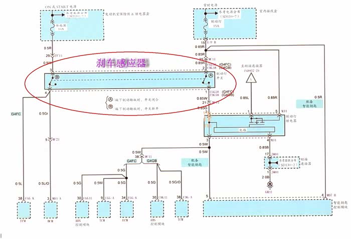 刹车系统电路检查。查完保险丝等一切都正常,刹车灯也能点亮。心想这要是锁止电磁阀故障就麻烦啦。于是开拆档杆护板机构(白拆啦)检查电磁阀也没问题,电磁阀由室内接线盒的后雾灯保险丝供电(正常),接地由BCM控制,进一步检查接地没有信号。拆下刹车感应器测试,两组全部导通。原来问题出在这里,拆开修复。装好车故障排除。