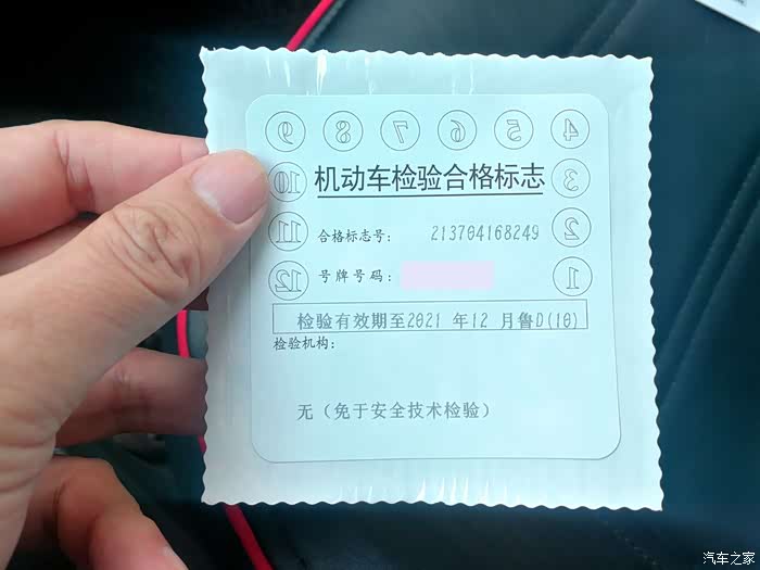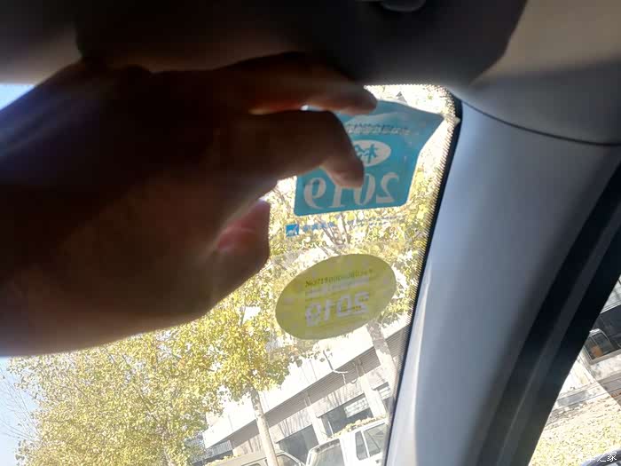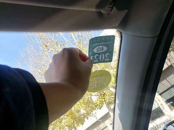 检验结束,来到车内,先把前挡风玻璃右上角的旧年检标志撕掉