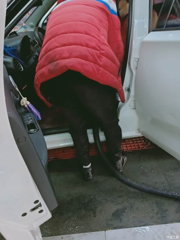 洗车小哥在用吸尘器吸扫车的内部。