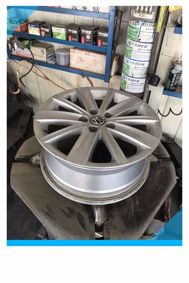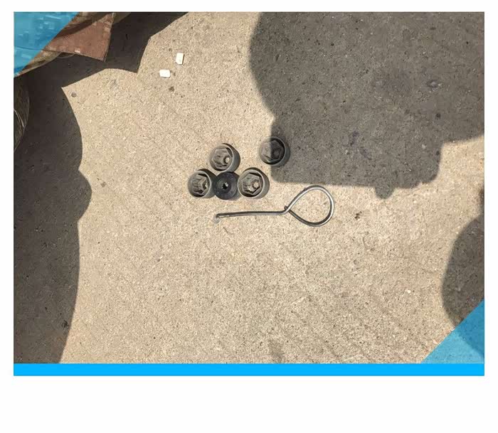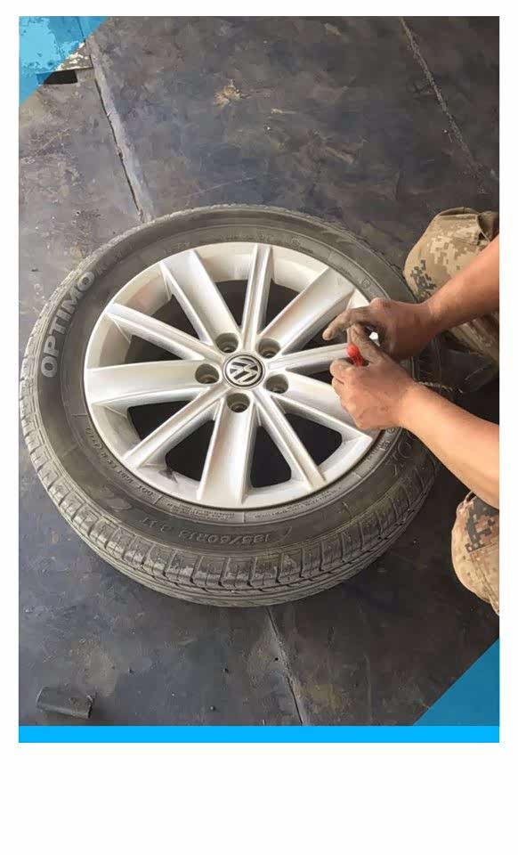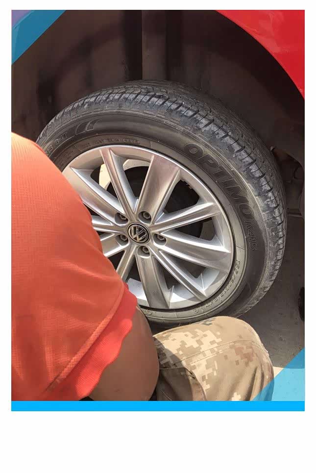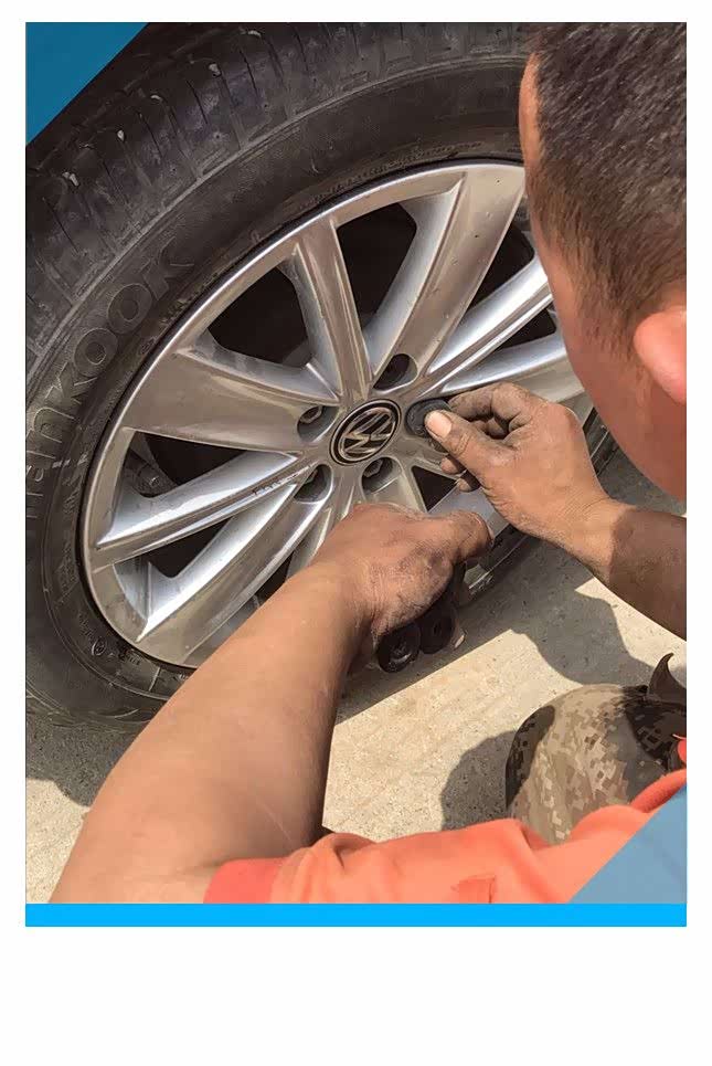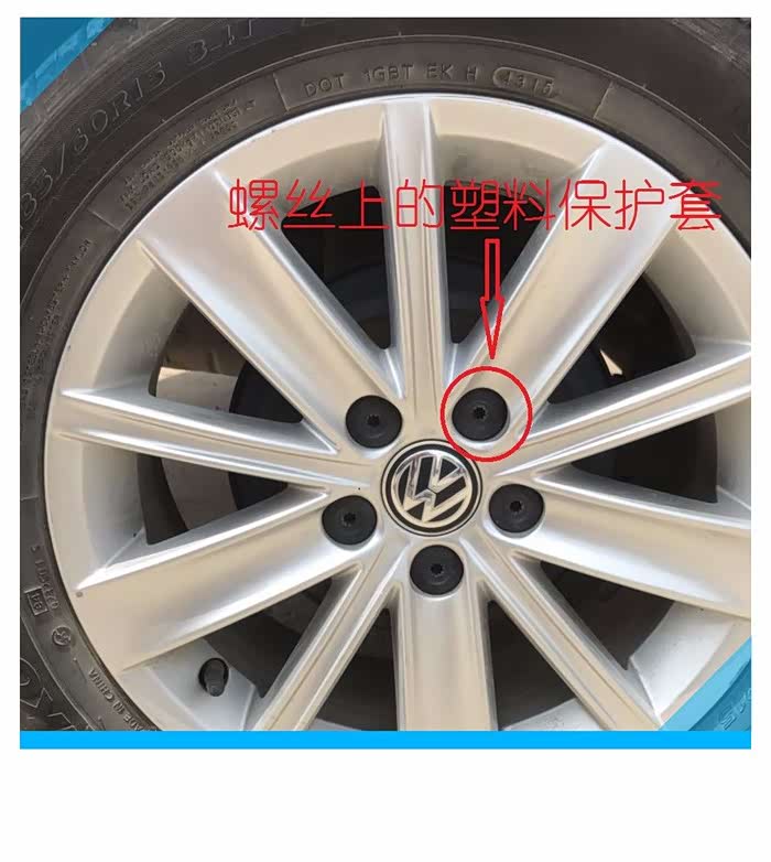 POLO的轮毂采用5颗螺丝进行了固定,螺丝上面安装了塑料保护套,保护套可以防止泥浆等脏东西污染螺丝,一方面保证了螺丝清洁、不受污染,另一方面可以延长螺丝的使用寿命,如果自己更换备胎的话,随车带有拆卸螺丝和保护套的工具,修理厂的师傅用的是自制的小工具,小工具采用铁丝制作,虽然很简单,但很实用,我还没来得及拍照,5个螺丝保护套就被取下来了,把螺丝保护套放在车轮旁边备用。