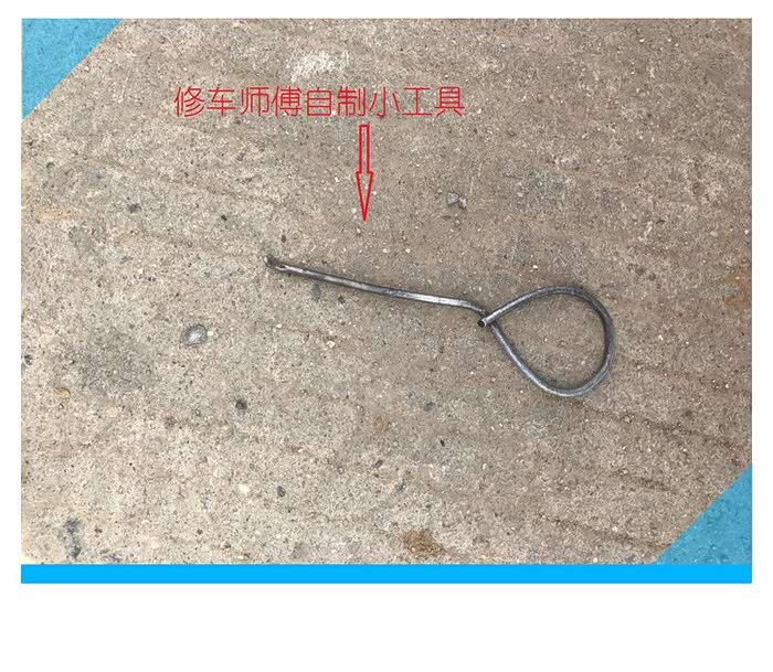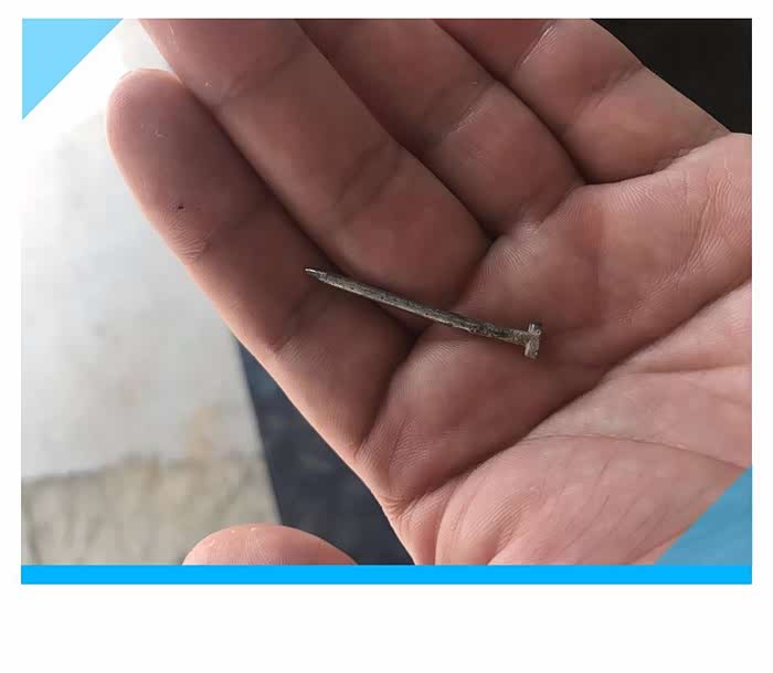 师傅找到了扎破轮胎的钉子,先用小锤子从轮胎内侧敲打,待小钉子大部分漏出轮胎胎壁后用钳子夹出来,这么长的钉子,我想知道你是从哪里来的,先把钉子收起来,一会放到垃圾桶里。