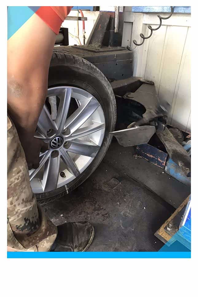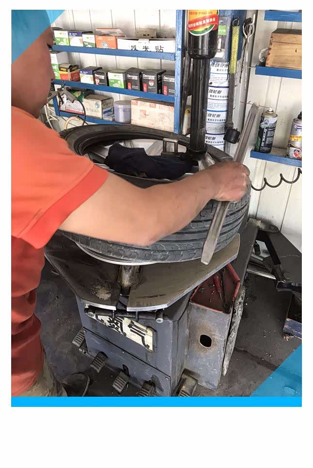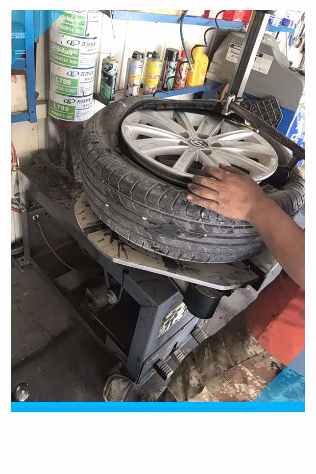 上机器操作准备扒掉轮胎,轮胎铲主要是把轮胎和钢圈彻底分离,将轮胎放到指定的位置上,反复转动轮胎并把轮胎铲卡入钢圈和轮胎缝隙中,踩住轮胎铲操作踏板,使轮毂和轮胎彻底分开。