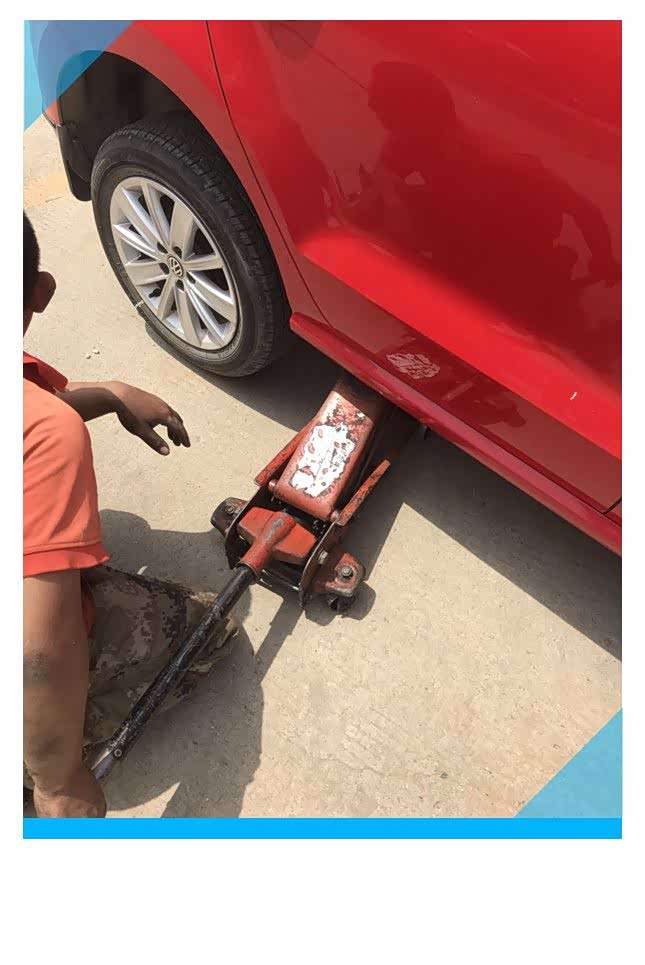 修理店的卧式气动液压千斤顶,好像修理店都是用这种千斤顶吧,我见到过女生用过这种千斤顶修车,操作简便、快捷。千斤顶支撑的位置很重要,车辆两侧下面结构梁位置都设计有千斤顶的支撑点,如果千斤顶没有放置在支撑点下就把车辆底盘撑起,会造成车架结构局部变形,严重的还有可能发生安全事故,所以一定要把千斤顶支撑在结构梁支撑点下部。