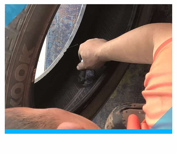 贴冷补贴片的时候要把冷补贴片的圆心和轮胎被扎破的小孔圆心位置尽量重合,这样补出来的效果更好,贴好后师傅采用橡胶锤多次捶打,锤击可以把贴片中的起跑挤出来,同时让贴片和冷补胶粘贴的更快速、牢固。