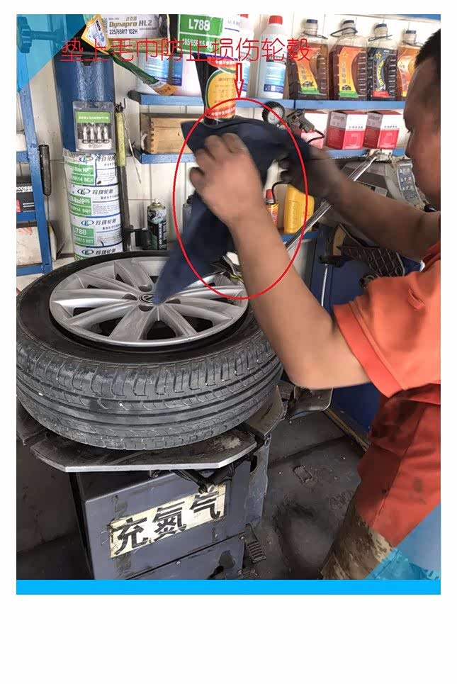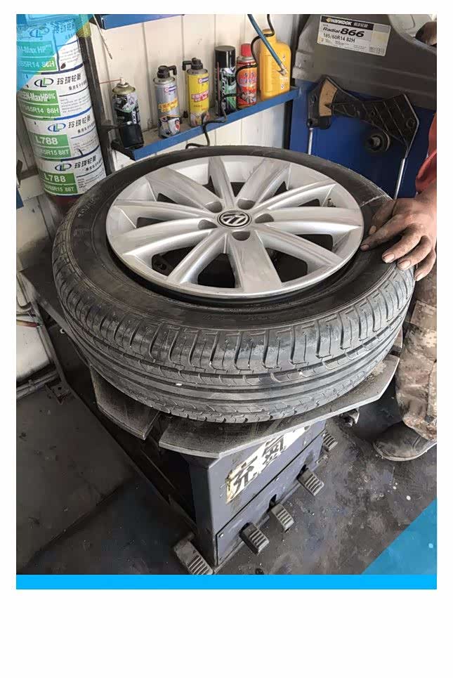 装轮胎的方法和拆轮胎差不多,不过需要注意的是先确定好气眼的位置,因为提前在轮胎上做了标记,所以告诉师傅尽量按照标记线进行安装,扒胎机拆装臂压住轮胎边缘,开启操作装置,轮胎随着机器的转动一点点的被压入到轮毂中,轮胎就安装好了。