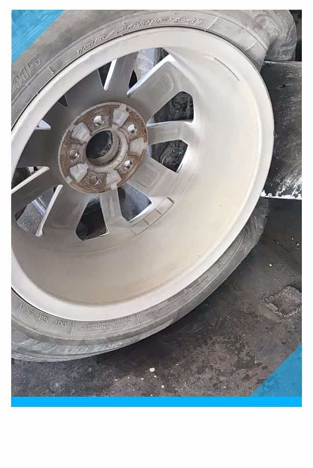 我以为卸掉螺丝轮胎就能拆下来了,师傅上下晃动了几下轮胎,看起来还挺紧,然后用脚上下来回的踹了几脚,轮胎还是牢固的固定在上面,估计师傅是踹的脚疼了,没一会拿过来一把大锤,从轮胎里面胎壁位置砸下去,这样轮毂连同轮胎才被卸了下来;可以看到刹车盘上已经有很多锈迹,应该是刹车盘和和装配孔装配紧密,生锈以后和锈迹粘结到一起,所以很难拆卸下来。