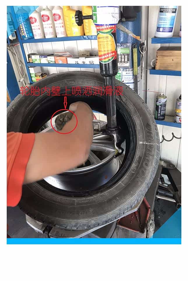 轮胎修补原来这么简单,下面需要把轮胎安装到轮毂上了,师傅拿来个矿泉水瓶,瓶盖上有一个小孔,里面不知道是什么液体,往轮胎内侧边缘喷洒了一些,经过询问得知,原来瓶子里面的是稀释的润滑液,安装轮胎前要对提前对轮胎内侧进行润滑,这样轮胎更好装。